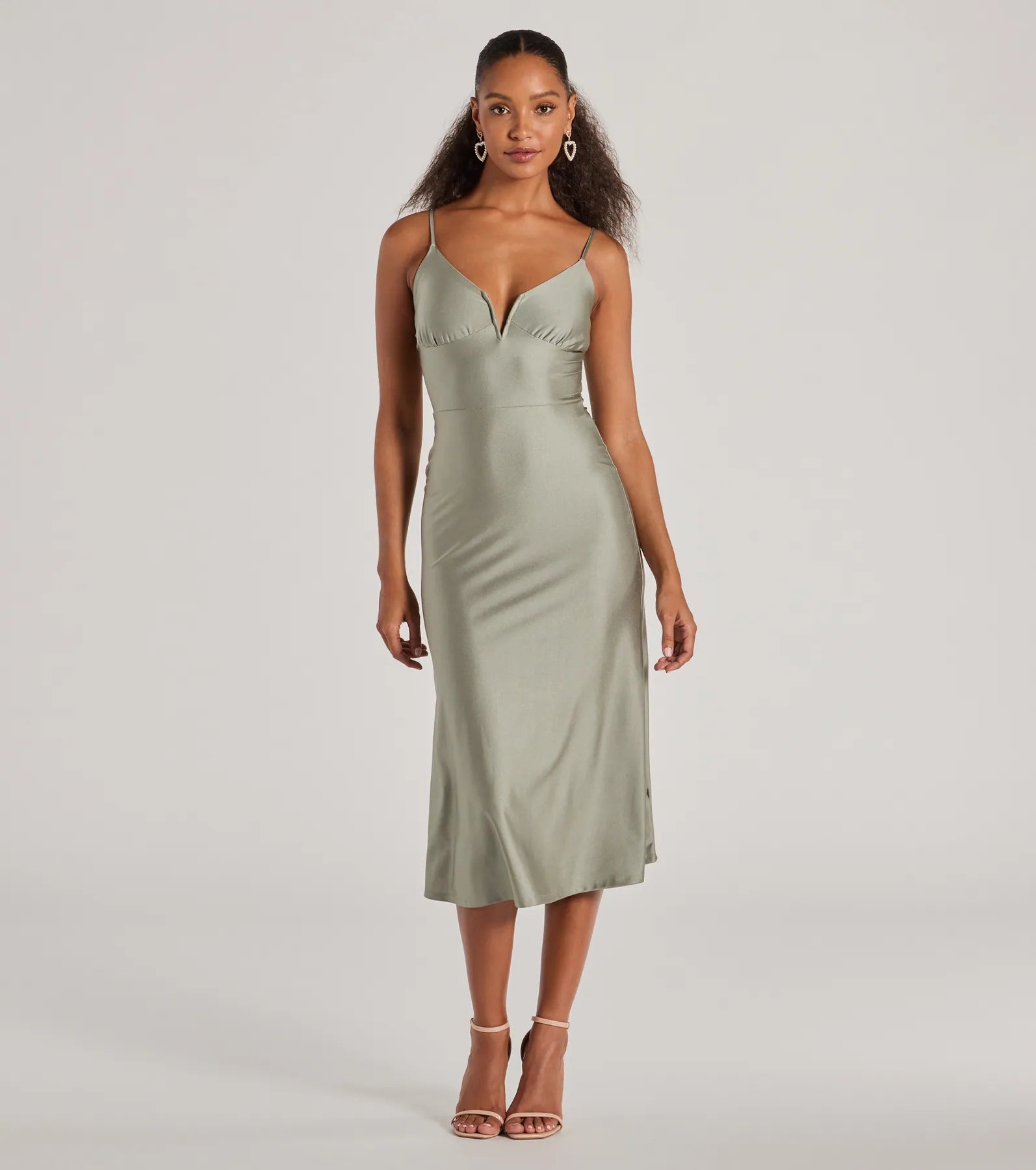 Raise a glass to your chicness in this sleeveless midi dress as a stunning wedding or party guest! The dress is designed with a wired V-neckline for a structured look. delicate spaghetti straps. and a flattering A-line silhouette that leads to the midi-length hem. Complete the look with earrings and .