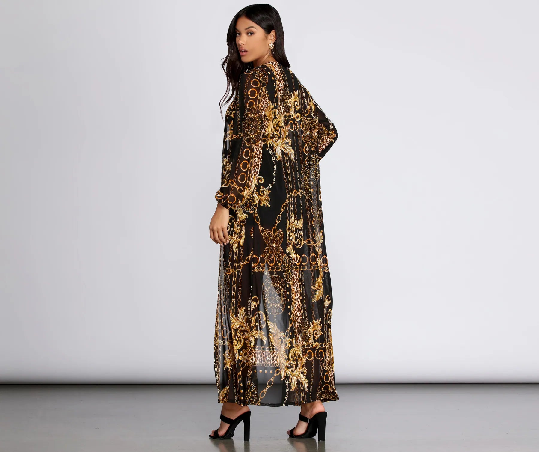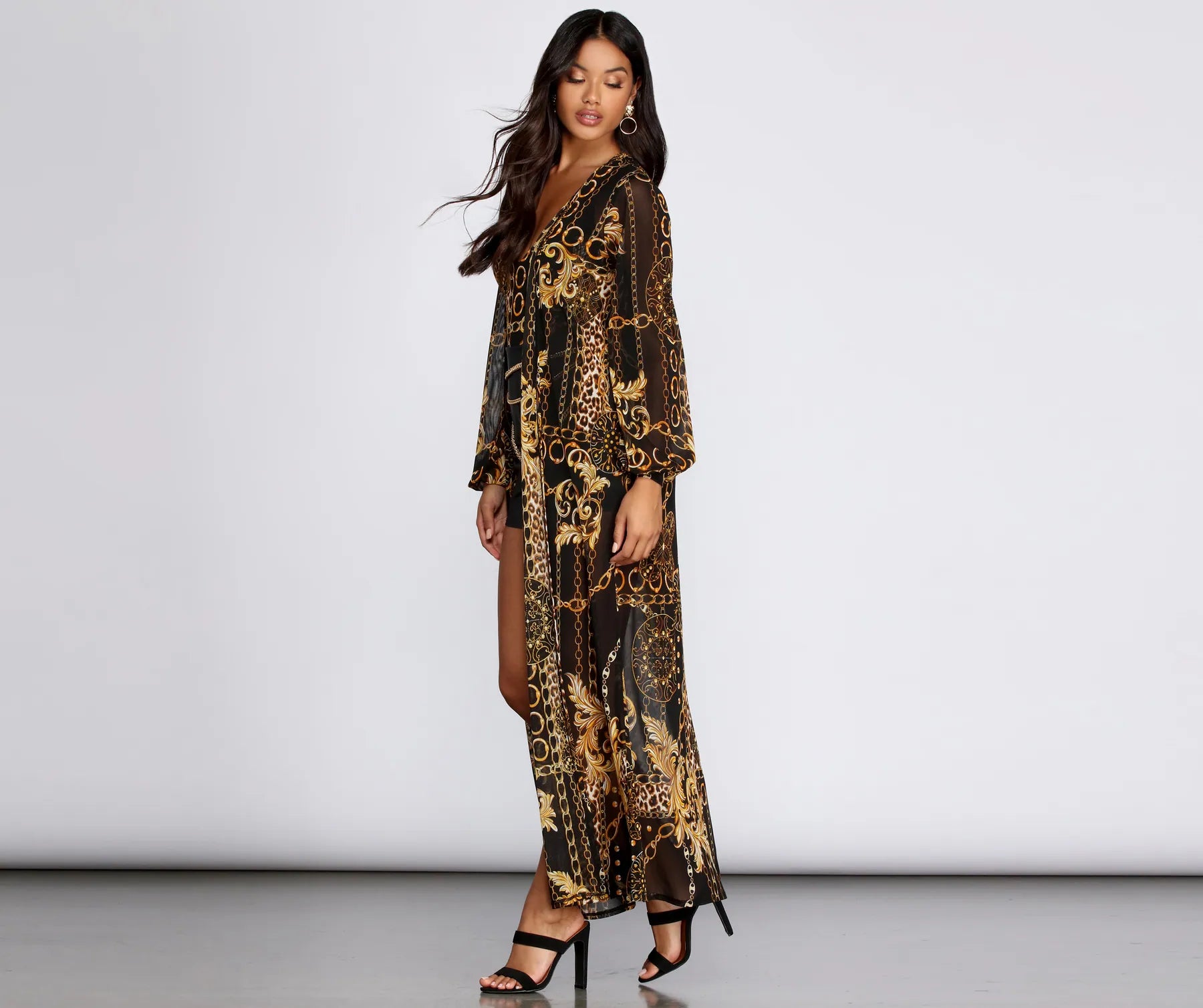 Work some chain prints into your look this weekend! This duster features long sleeves that puff at the wrist and a chain link print with touches of a gold leaf print. The hem of this duster is nearly floor length and is composed of a mesh material that offers moderate stretch. Don’t forget the matching bodysuit to complete the look!