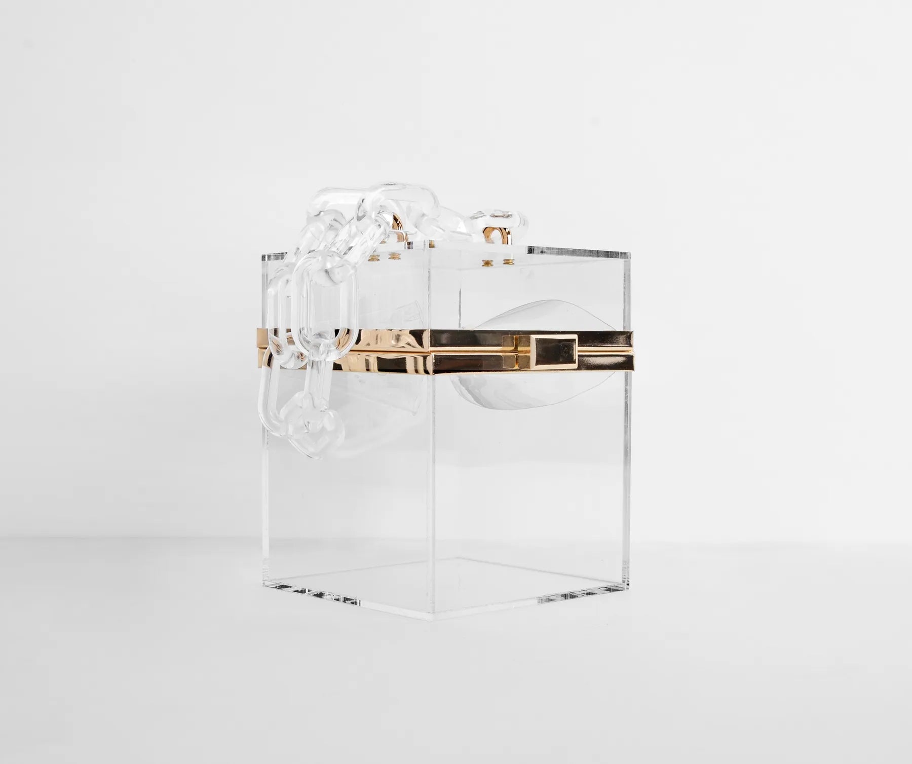 This structured box purse is so adorable! With a cube shape. its totally clear with a gold trim and a snap closure. Purse has a clear chain link handle. Since its clear you can pair with almost anything!
