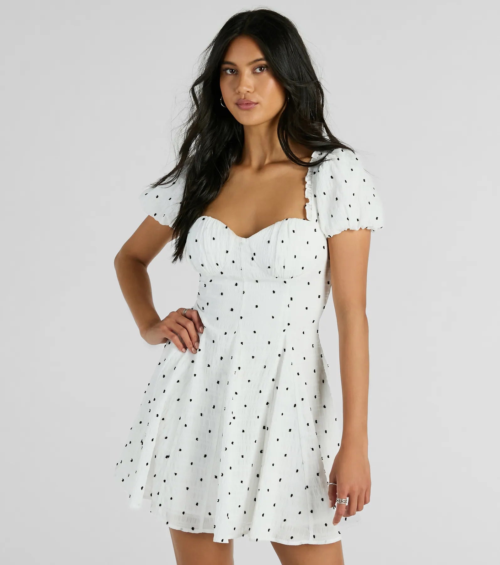 Envoke a charmed and cute style in this polka dot skater dress perfect for showers or graduates! Show off your curves with the sweetheart neckline and skater silhouette. while adding a touch of cuteness with the short puff sleeves. The tie-back adds a flirty detail and the short-length hem is perfect styling with trendy for a casual vibe.