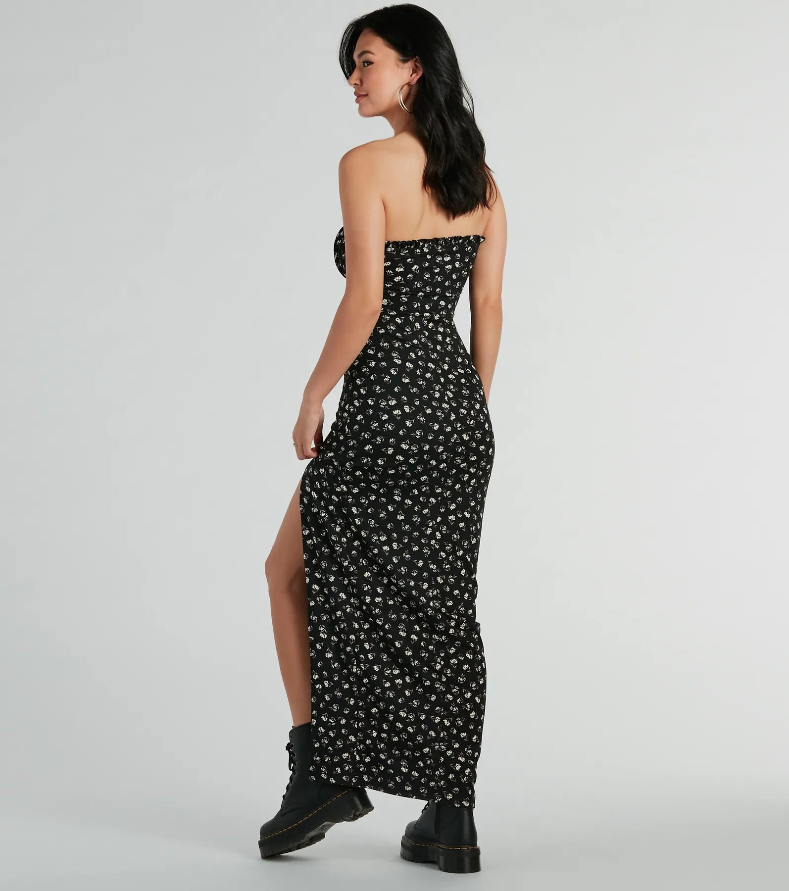 Your presence will always be charming in this ditsy floral maxi dress at wedding showers. brunch. or casual parties! Adorned in a stunning disty floral print. this strapless dress features a ruffle trim neckline and padded bra cups for flattering support. The curve-hugging silhouette. front slit. and maxi-length hem create a captivating look. while the brushed knit stretchy fabric ensures comfort. Pair with earrings and .