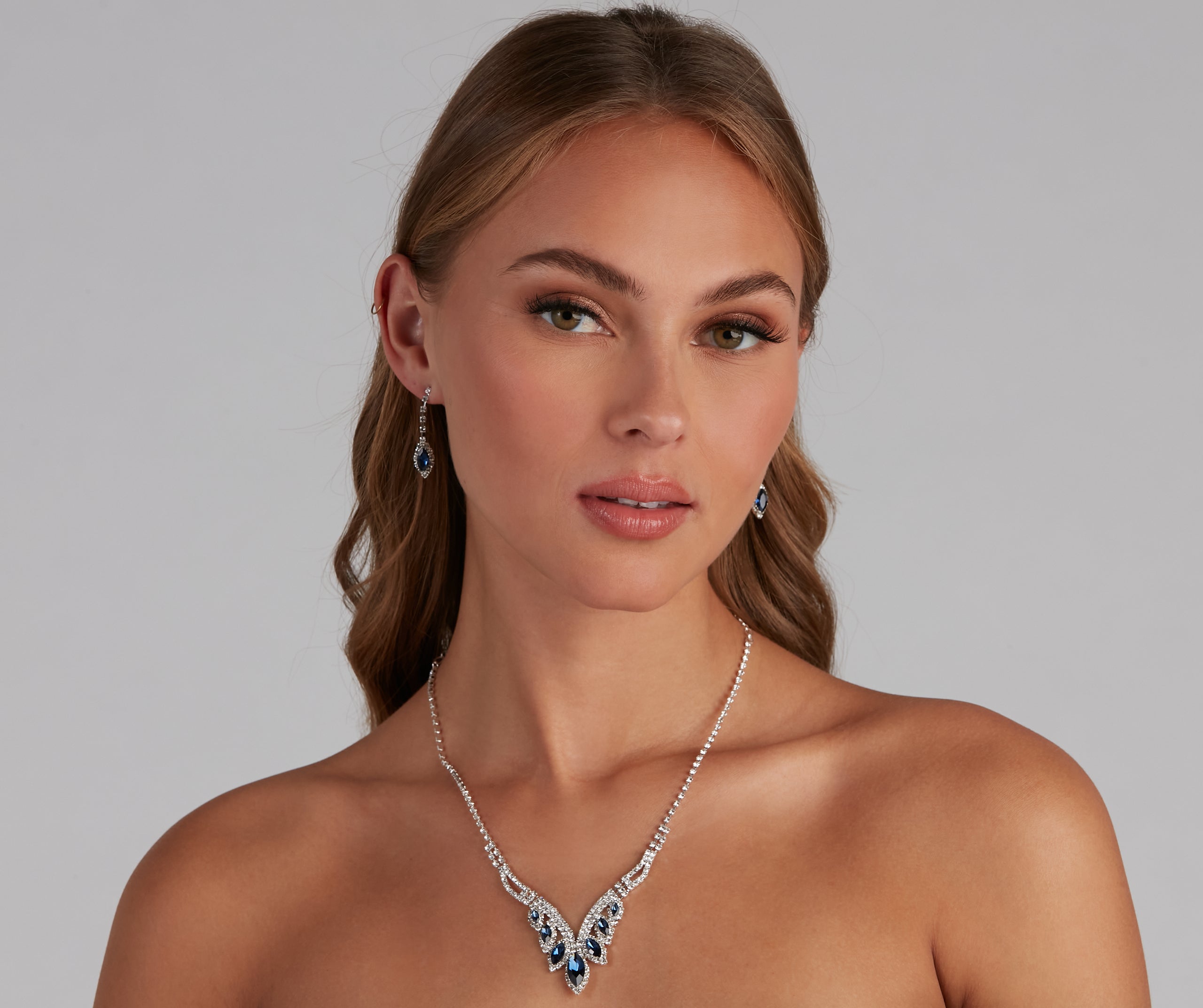 Showcase chic elegance with this gorgeous jewelry set. It features a V-shaped collar necklace with a single row of rhinestones leading to an intricate center design of teardrop-shaped gemstones outlined with mini rhinestones. The set also includes a matching pair of duster earrings with a single cascading gemstone design. Style this set with a luxe and heels.