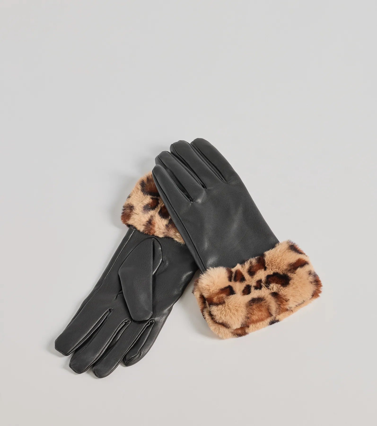 Cozy up and look luxe with these faux leather gloves with faux fur leopard cuffs that elevate every outfit. Pair with a coat.