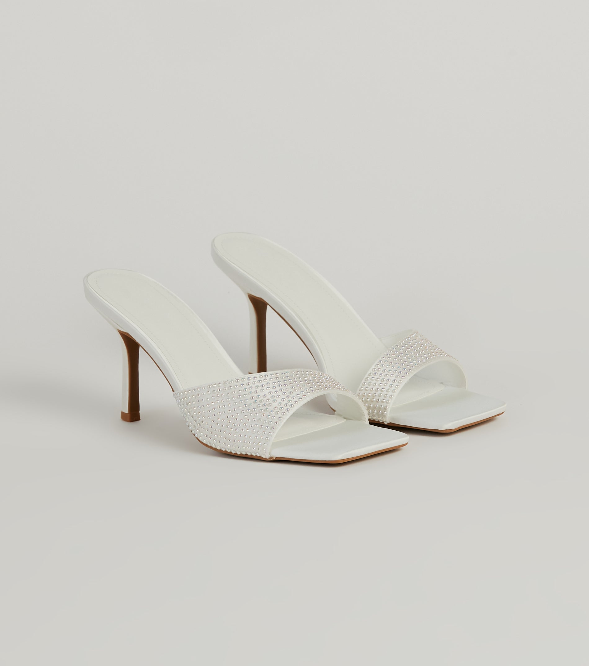 Make a chic first impression in these elevated stiletto mules! They feature an open square-shaped toe. an asymmetric foot strap with a mini iridescent studded design. a short stiletto heel. a sleek satin material. and a slightly cushioned faux leather insole. Style with a classic .