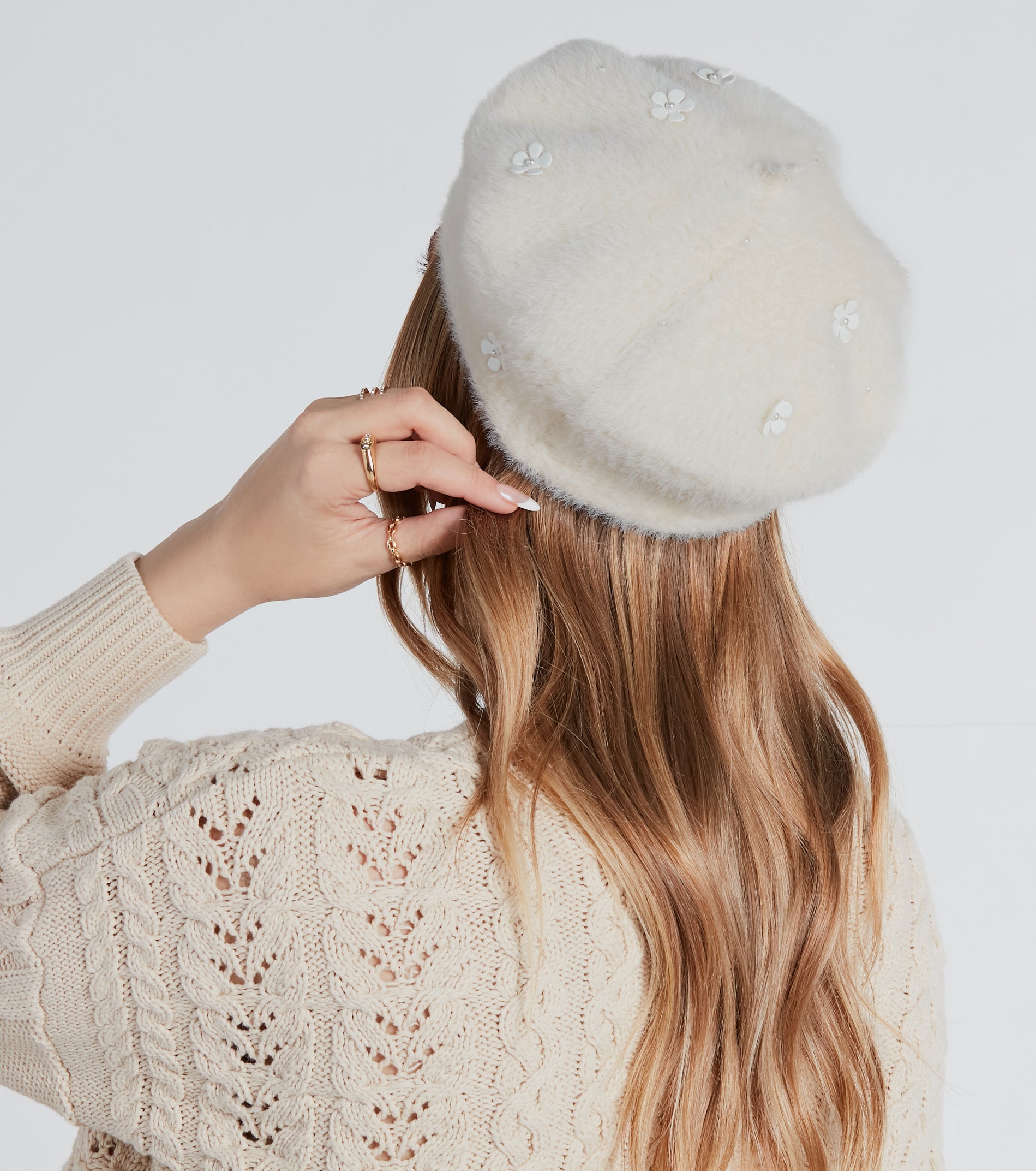 This trendy detailed beret will have you in a chic mood all winter long! It features a classic beret design crafted with a soft fuzzy faux wool material decorated with small flower accents with center faux pearl details and faux pearls throughout. Style with a and a mini skirt!