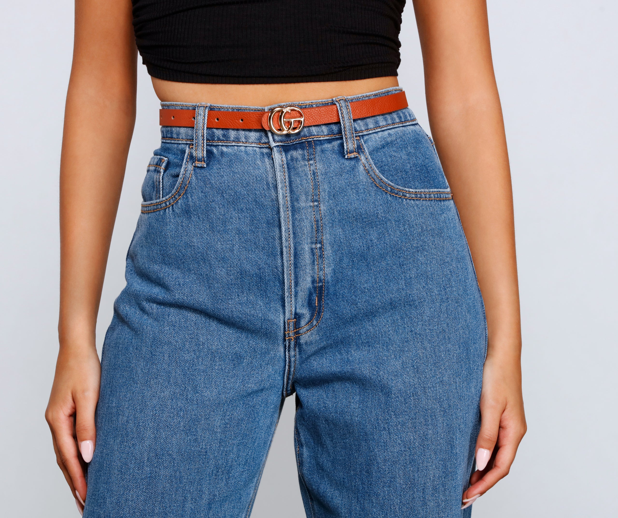 Level up your chic status with this sleek belt pack. It features three faux leather belts in cognac. ivory. and black with metal CG letter buckles. Style these belts with denim and .