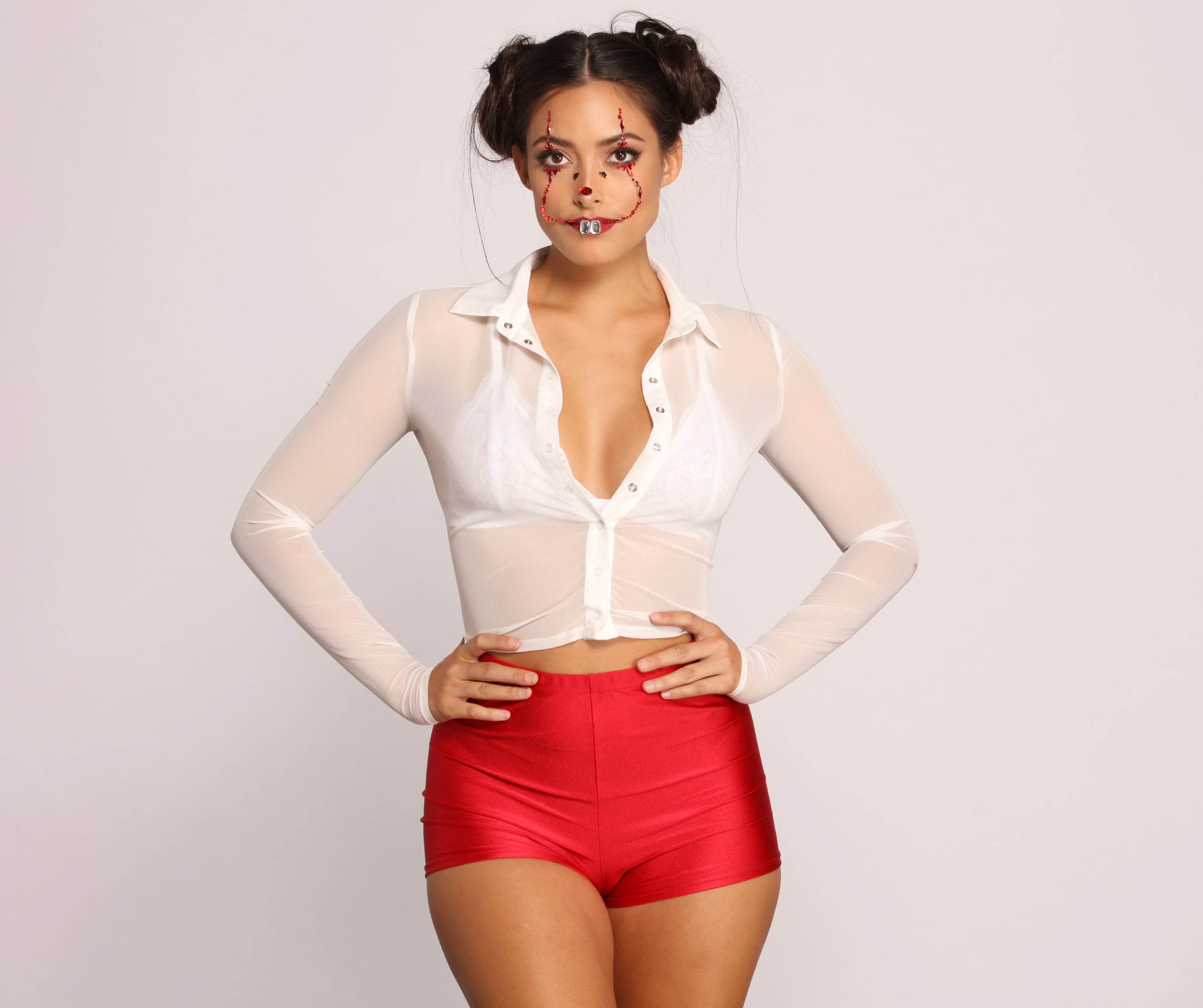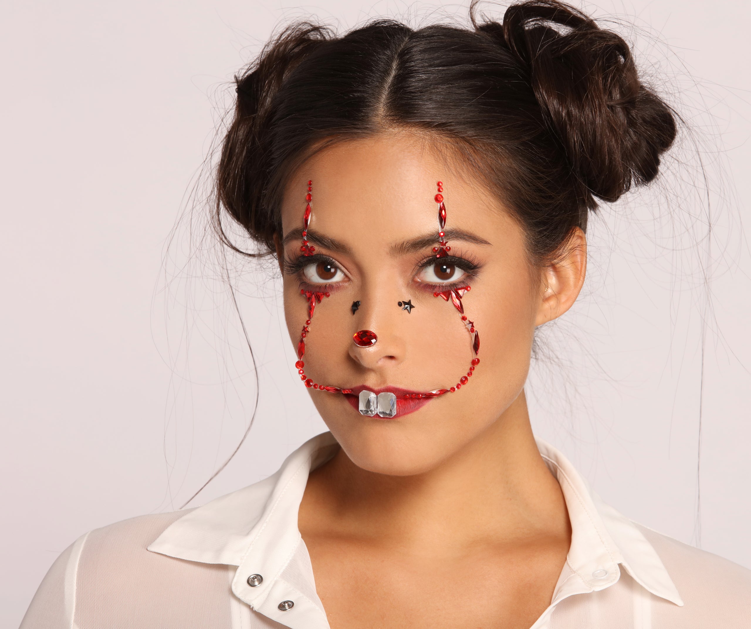 Sultry and spooky. these adhesive face gems will have you looking like a circus cutie for sure! The set features red. black. and clear hued face gems in the design of a curved up smile. Pair with some and a for a hauntingly pretty look.