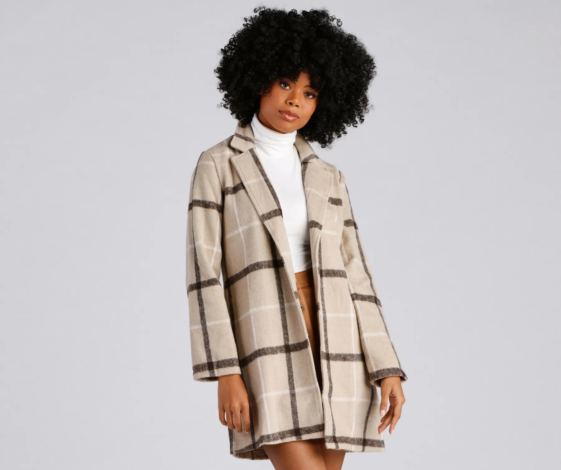 Layer on this long line plaid coat for a city-chic look! It features a lapel collar. long sleeves. an open front. lined pockets. and a relaxed fit. The thick faux wool fabric has a trendy all-over neutral plaid print. perf for the season. Style this coat with fab .
