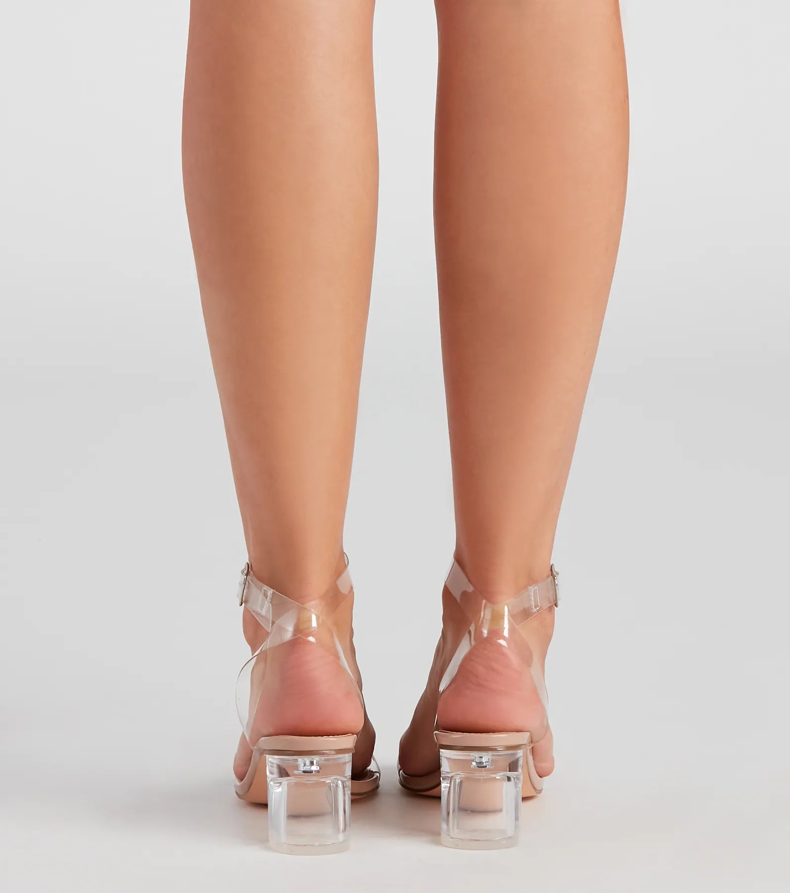 Clearly stay on trend in heels that keep your looks stylish and chic. The heels feature an adjustable ankle strap. an open almond toe with clear strap. and a lucite block heel. Complete your look with a and .