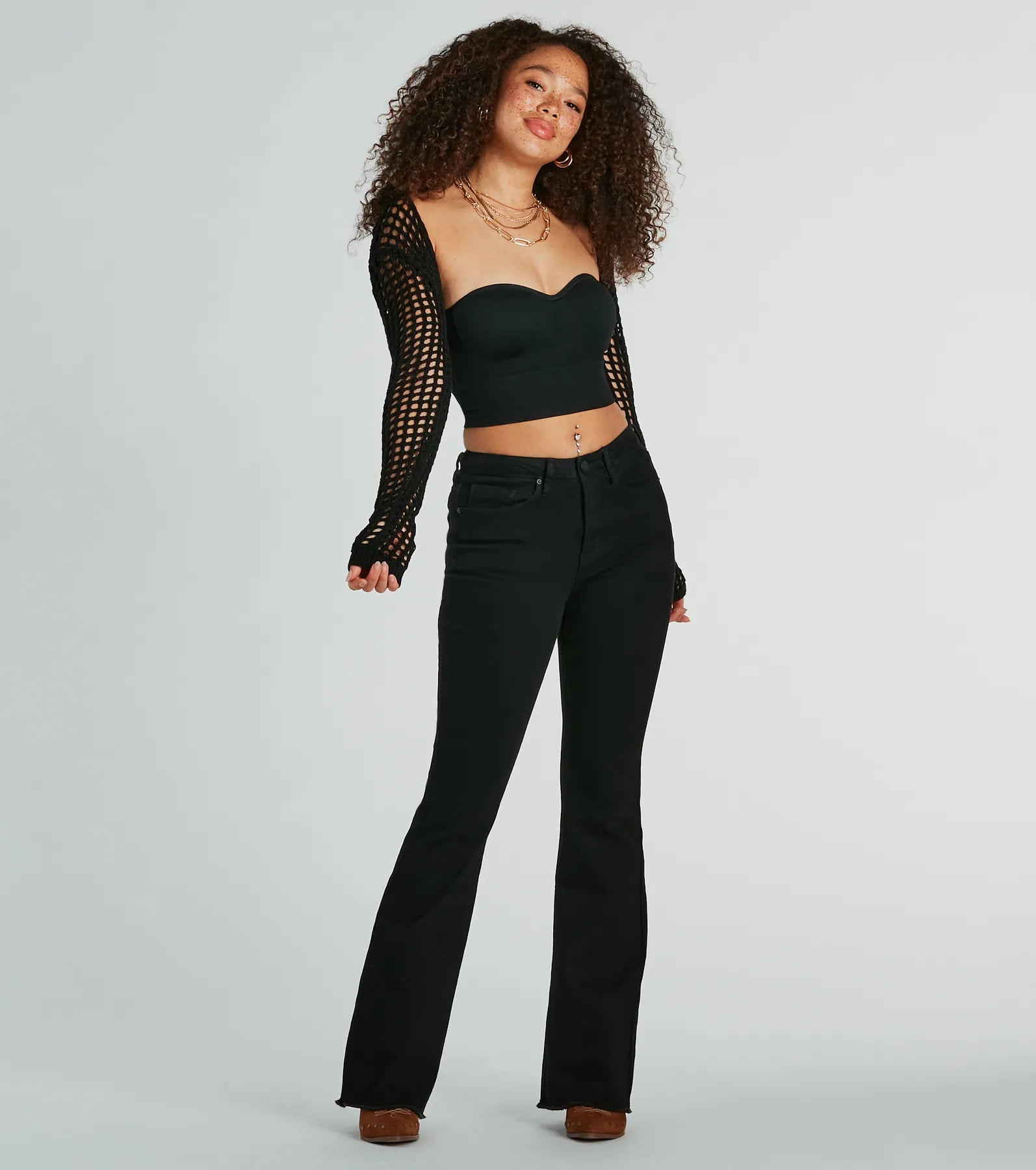 Style up this?sheer crochet knit bolero for a coastal chic vibe! It features long sleeves. an open front. and a majorly cropped hem. Wear this lightweight layer over with denim shorts.