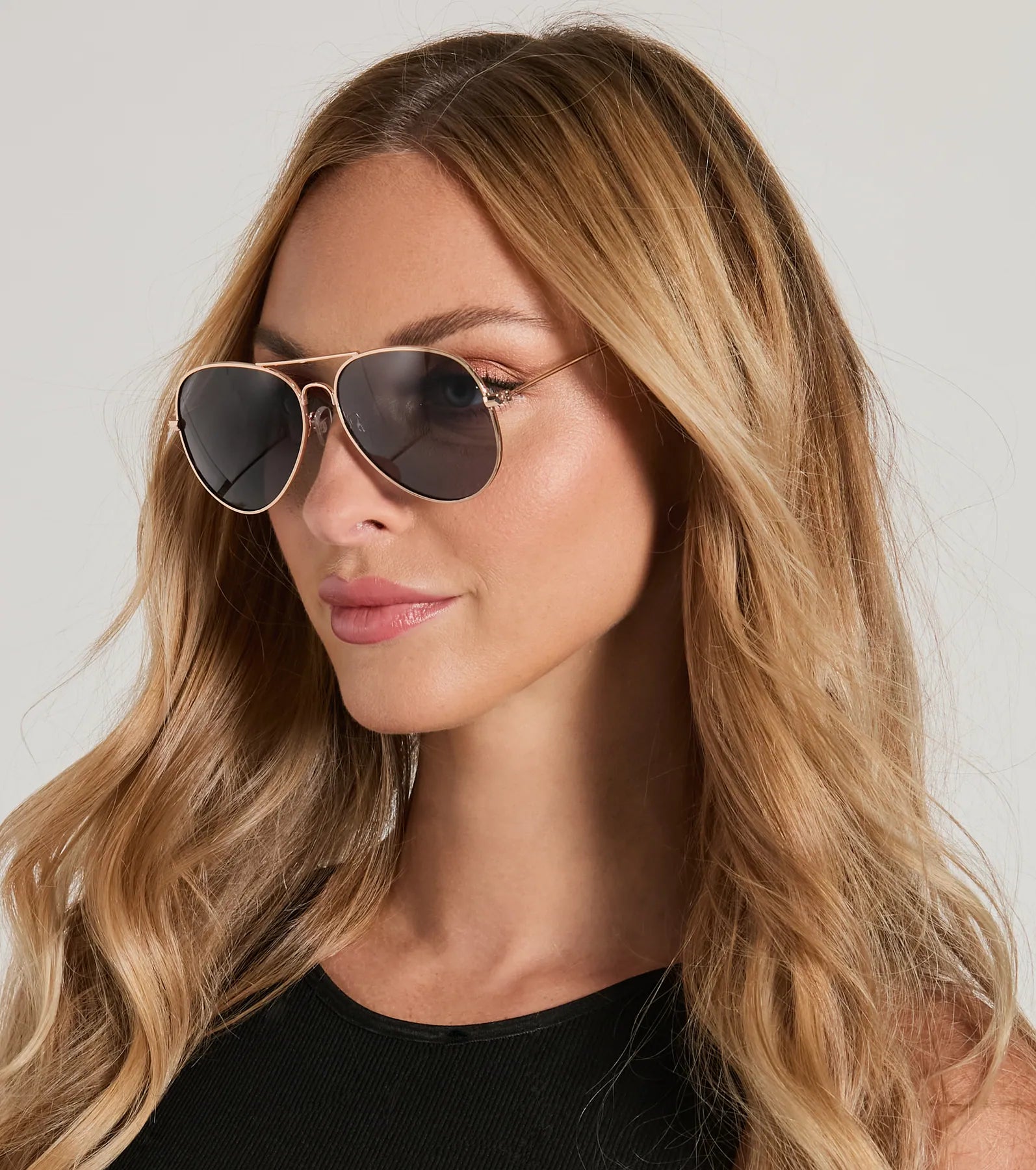 Make any outfit cool in these aviator sunglasses! They feature a sleek metal frame. smoke-tinted lense to help protect your eyes. and rubber nose supports and arms for comfort. Complete the look in trendy .