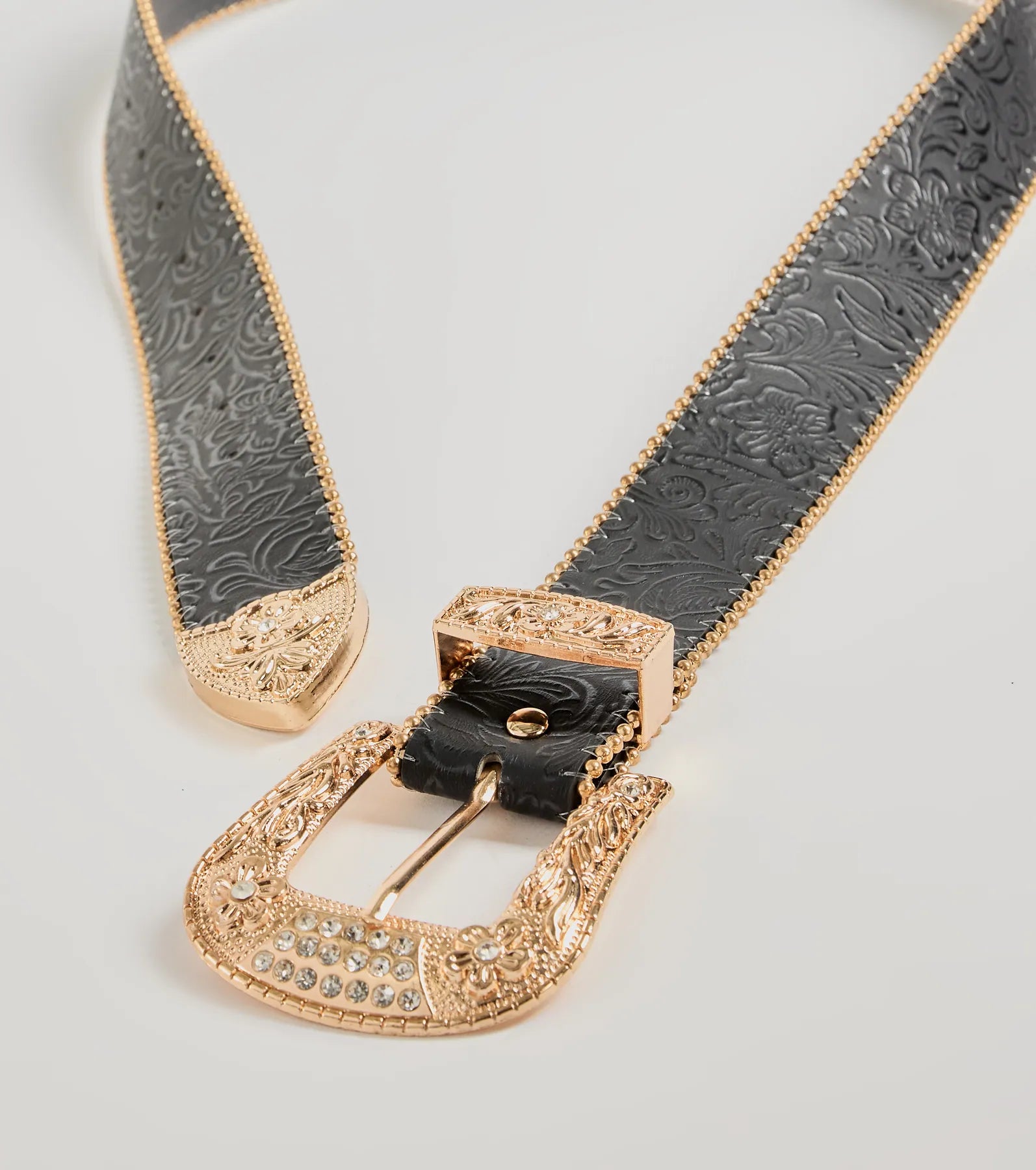 Channel those chic country vibes with a faux leather belt that features western-inspired embossing and a square metal buckle. Complete with high-waist denim jeans and a denim jacket!