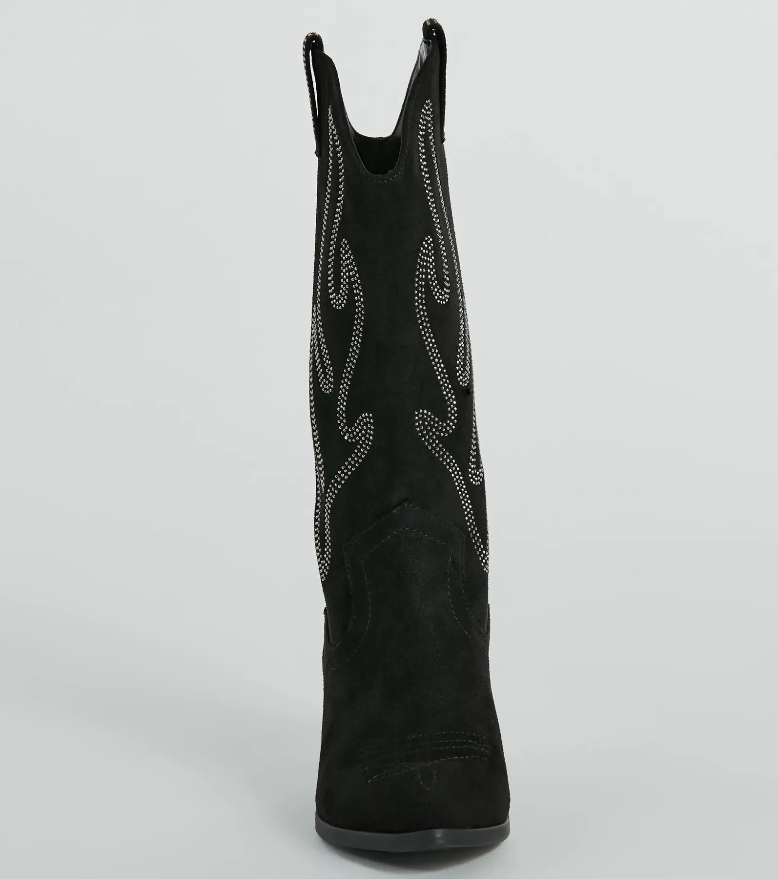 These faux suede cowboy boots will have you looking like a countryside cutie at festivals. concerts. and bachelorettes! Made from soft faux suede material. these under-the-knee boots feature a pointed-toe with a trendy embroidered accent. a stacked block heel to elevate your look. and a western-inspired rhinestone embellished pattern. Complete the look in a?!