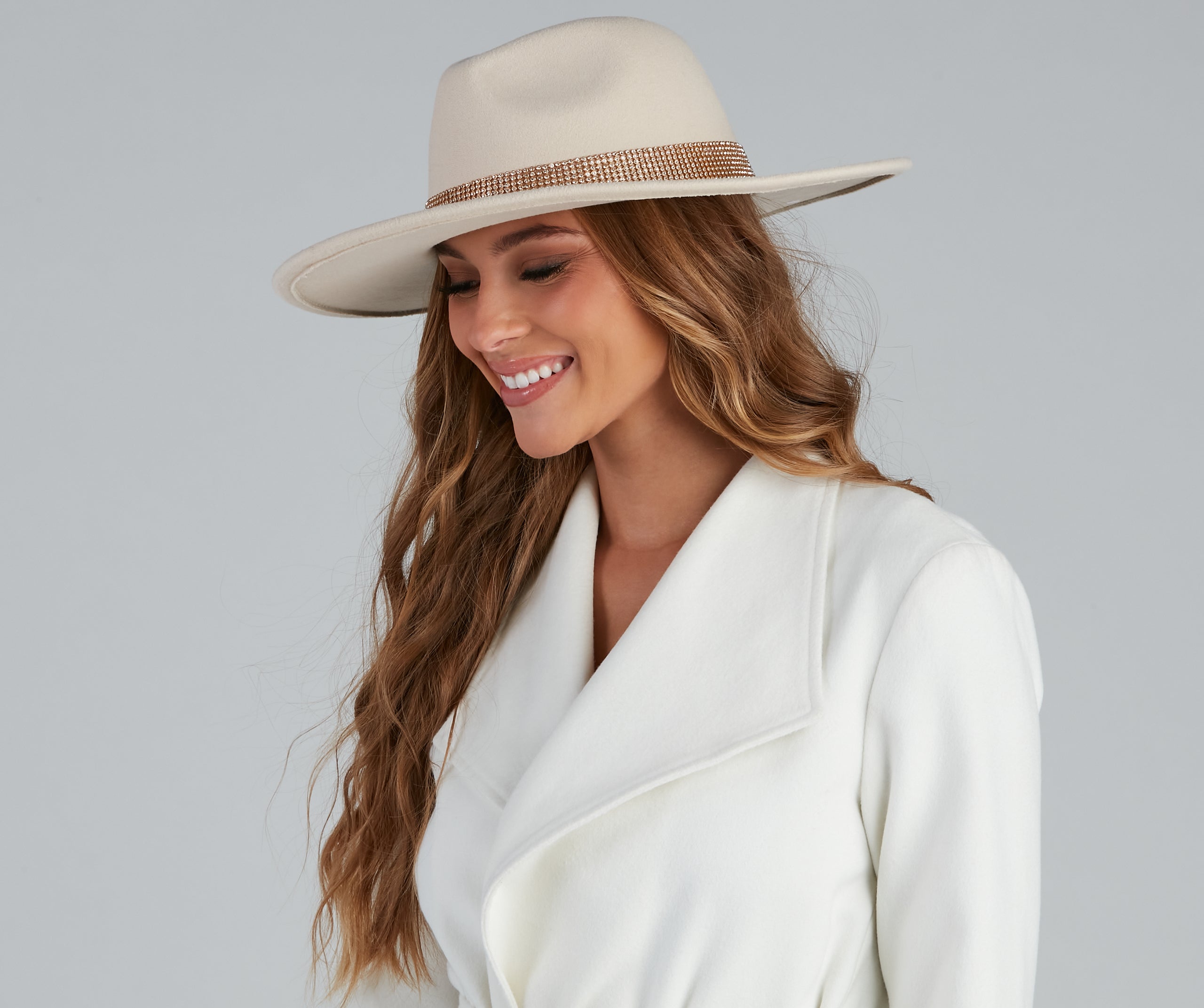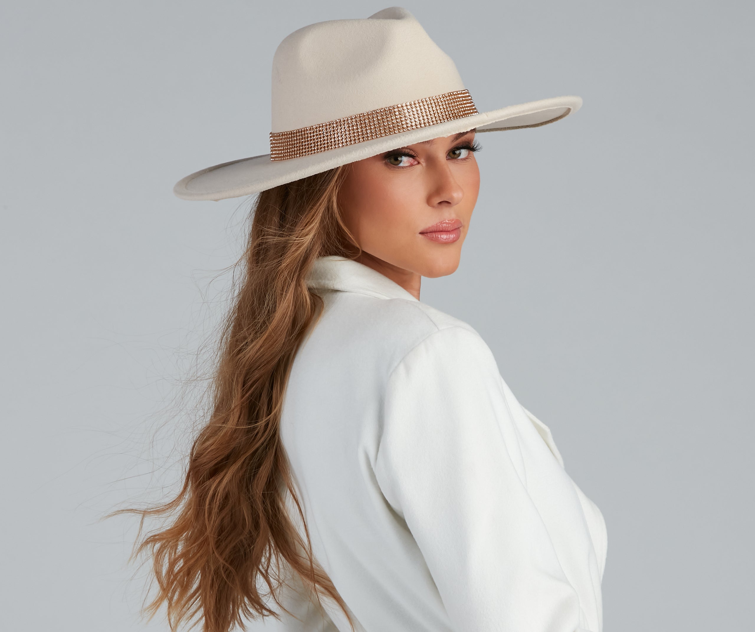 You’re one glam country girl in this Panama hat featuring a rhinestone band. wide brim. and faux wool material. Complete the look in a chic