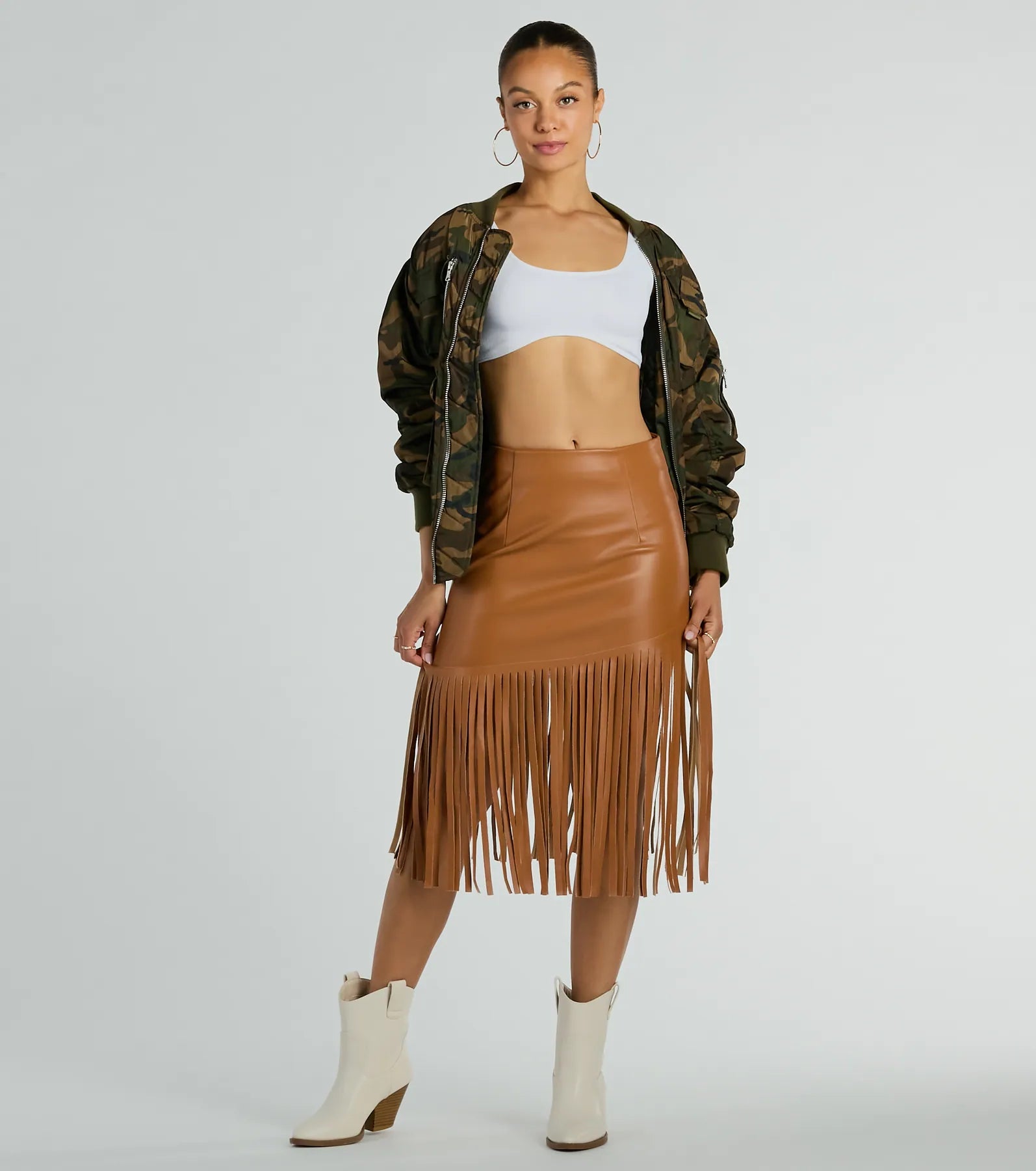 Sway to the beat of your favorite country songs in this faux leather midi skirt at festivals and concerts! The midi skirt boasts a flattering high-rise waist. bodycon fit. and eye-catching long fringe perfect for dancing. Complete the look with a .