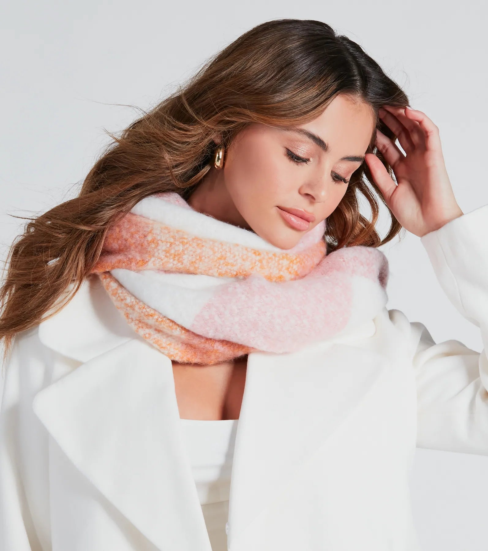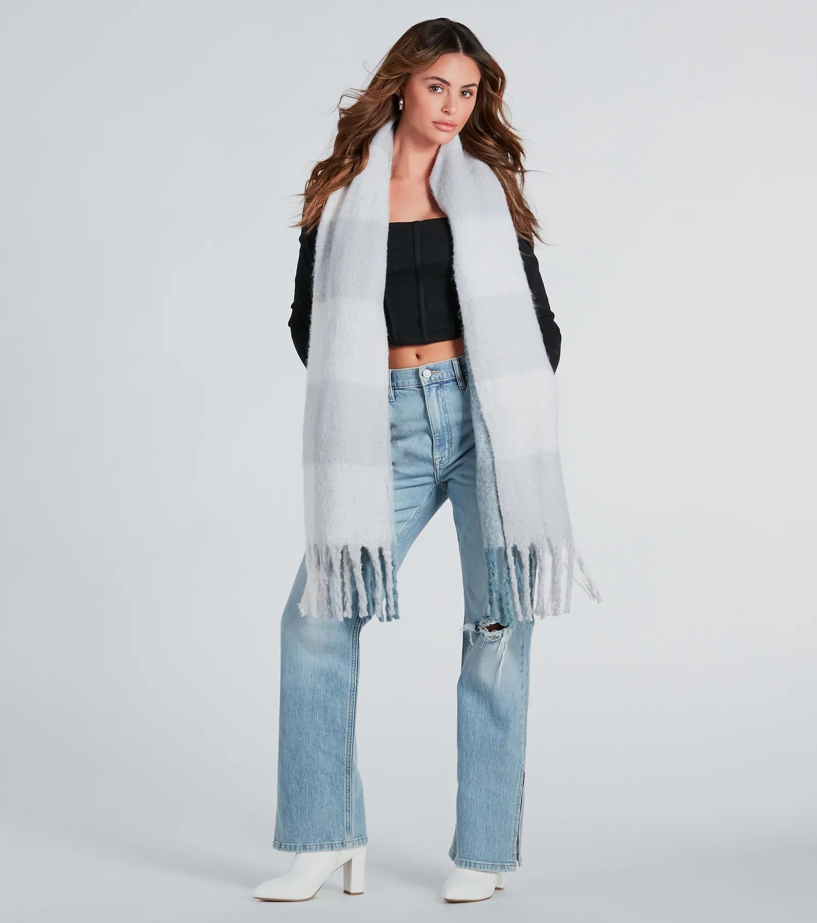 Layer on this adorable colorblock fringe blanket scarf for a cozy stroll to grab coffee! Composed of a soft fuzzy woven material with trendy fringe hems and a cute colorblock pattern. this long scarf is a stylish staple for the season. Pair with a and booties.