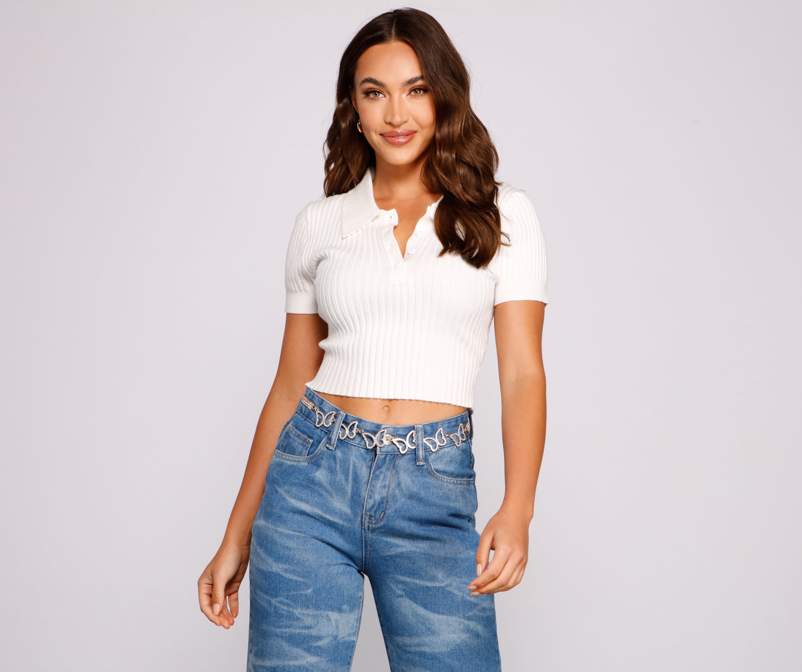 Keep it cute and chic with a belt that adds that sweet detail to your outfit! The belt features a dainty chain link. rhinestone embellished butterfly accents. and a lobster clasp closure. Complete look with and a puff sleeve top.