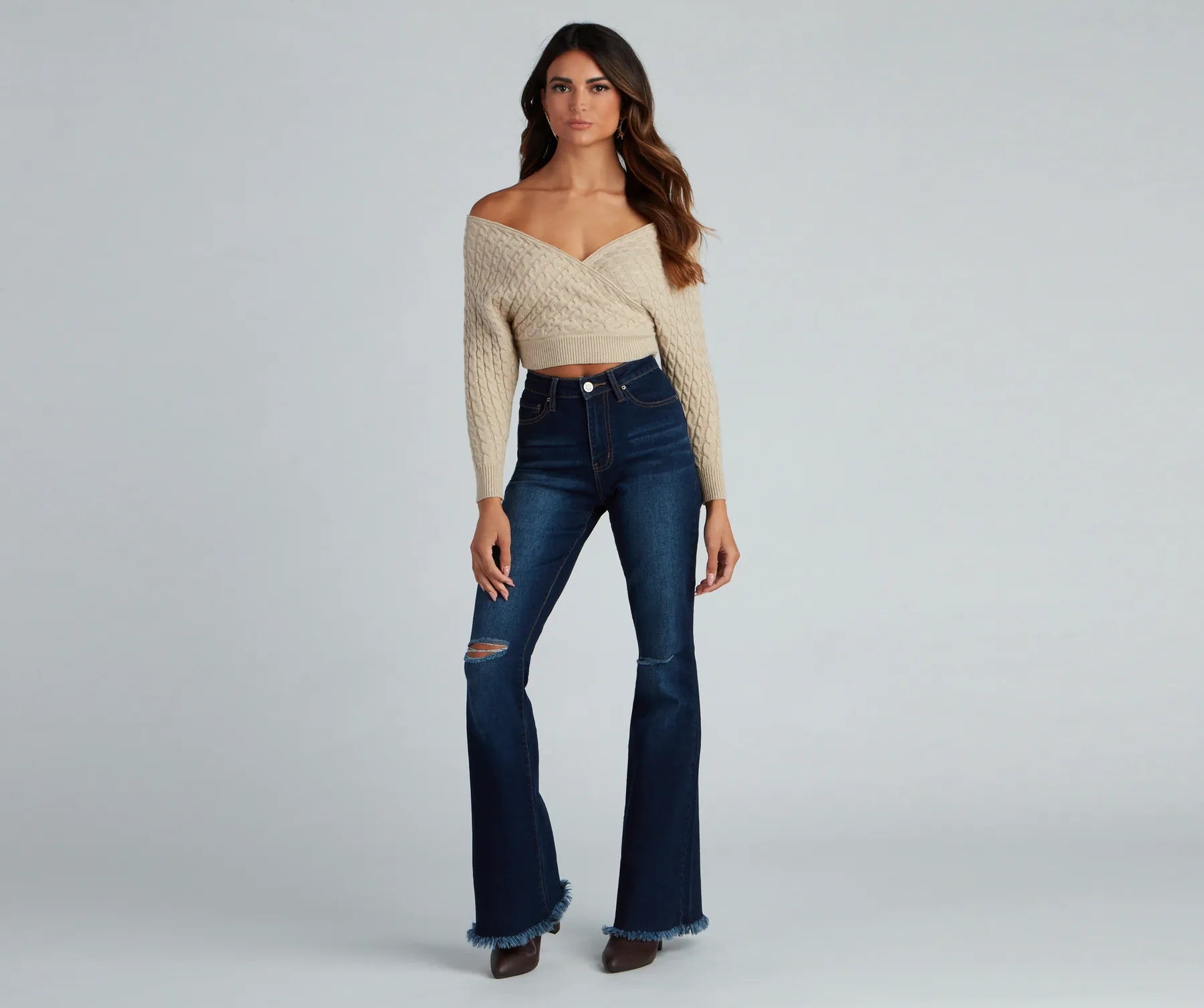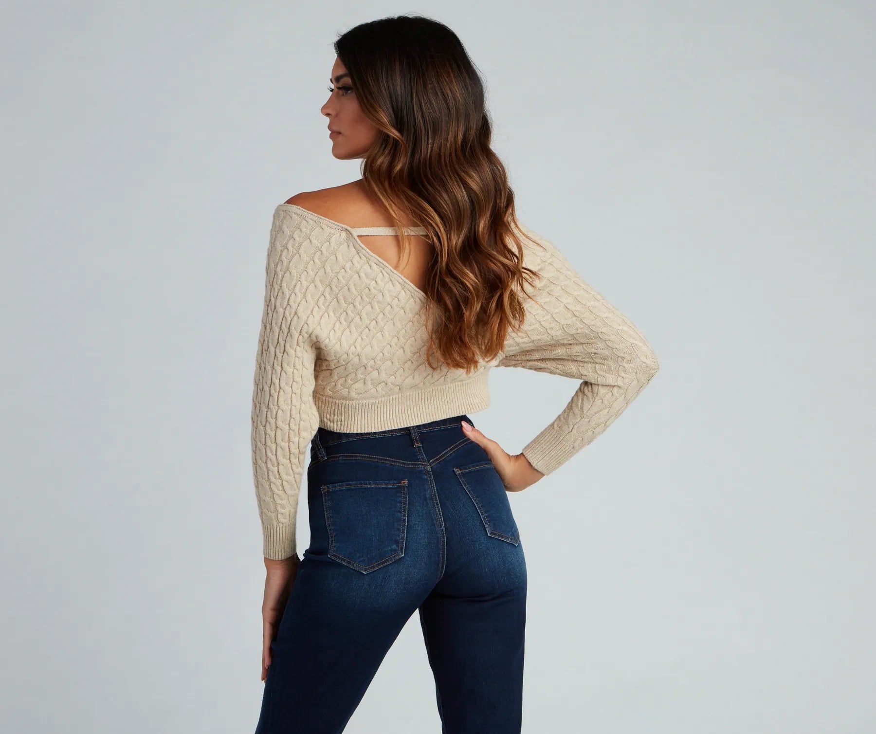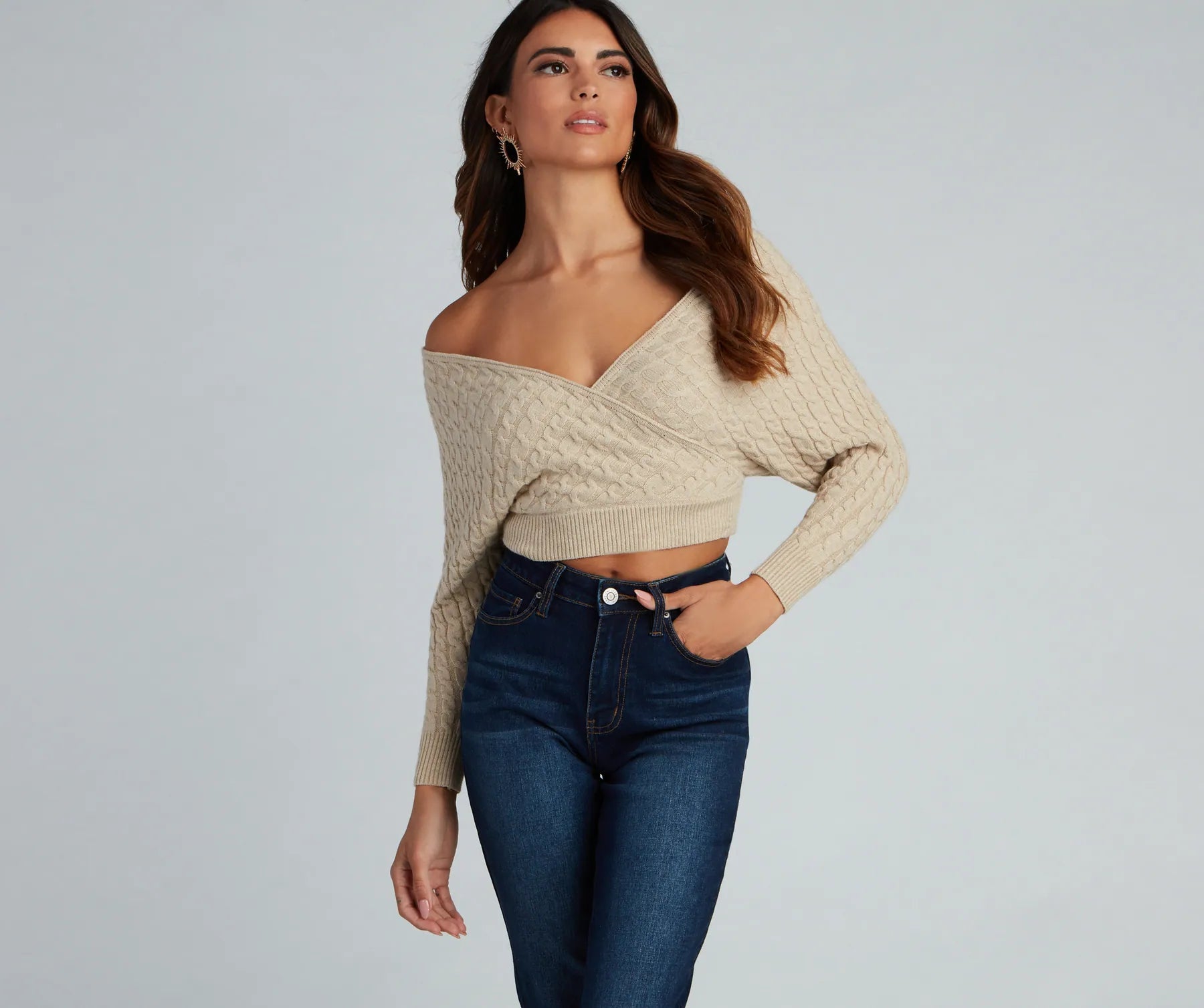 This crop sweater will give you chills because of how cute it is! It features long sleeves. an off-the-shoulder neckline. and a surplice accent that shapes the open-back design. The purl knit fabric offers a moderate stretch. Style with high-rise