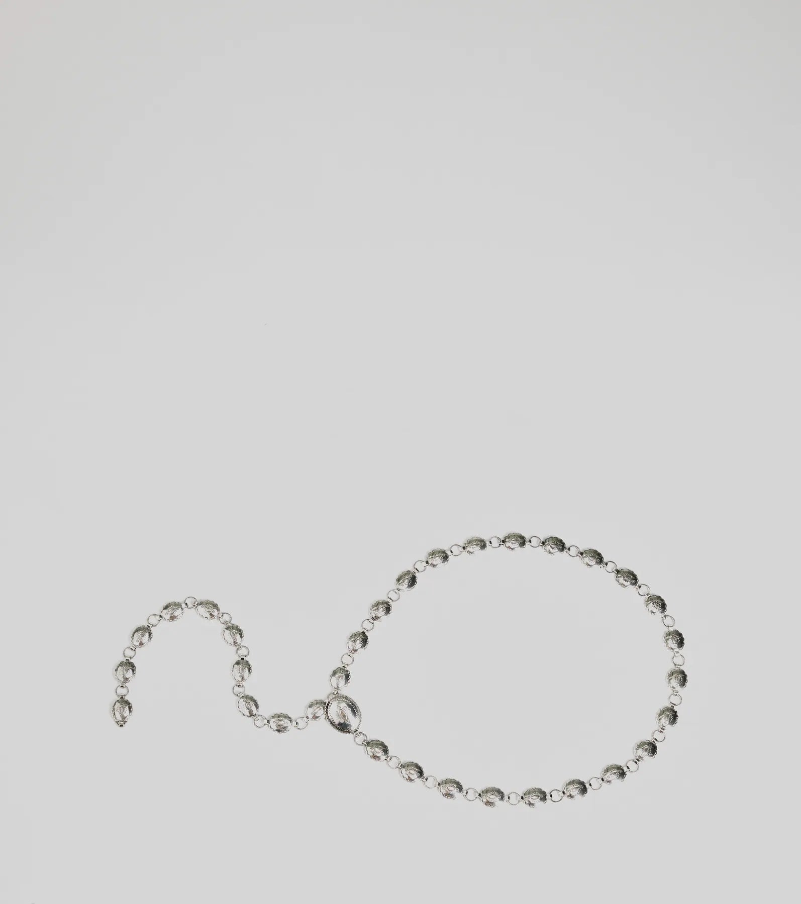 Bring that western charm with a chain belt that features a mini concho design and clasp closure. Complete your look with a fringe romper and boots.