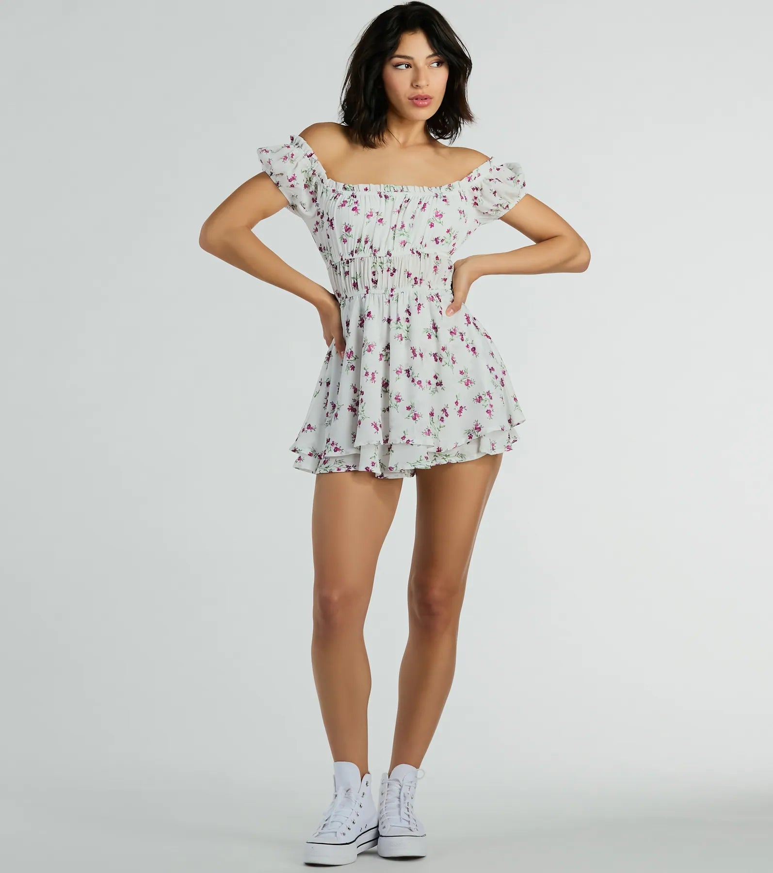 Give off the cutest vibe showcasing your beauty in this floral chiffon romper! The lightweight chiffon woven fabric is detailed with an all-over dainty floral print pattern for a soft feminine look. The romper features a stretchy square neckline that can be worn off-the-shoulder with a ruffled trim. adorable short puff sleeves. a stretchy high waist with ruched detailing. and a short overlay over flowy shorts. The fit and flare silhouette will flaunt your gorgeous figure. Style with for the day and strappy mules for date night!