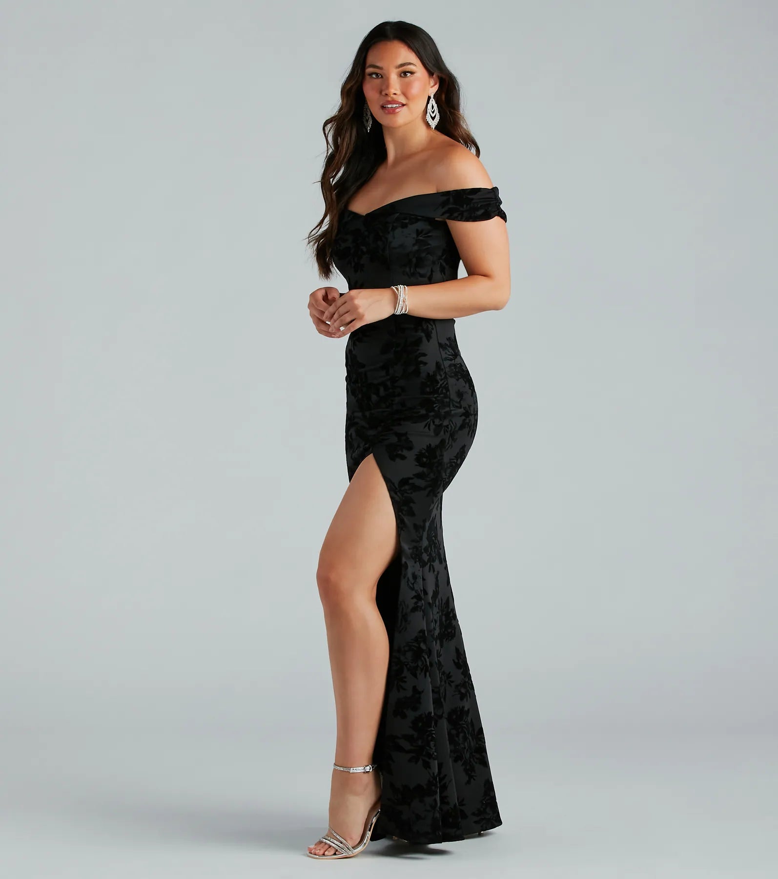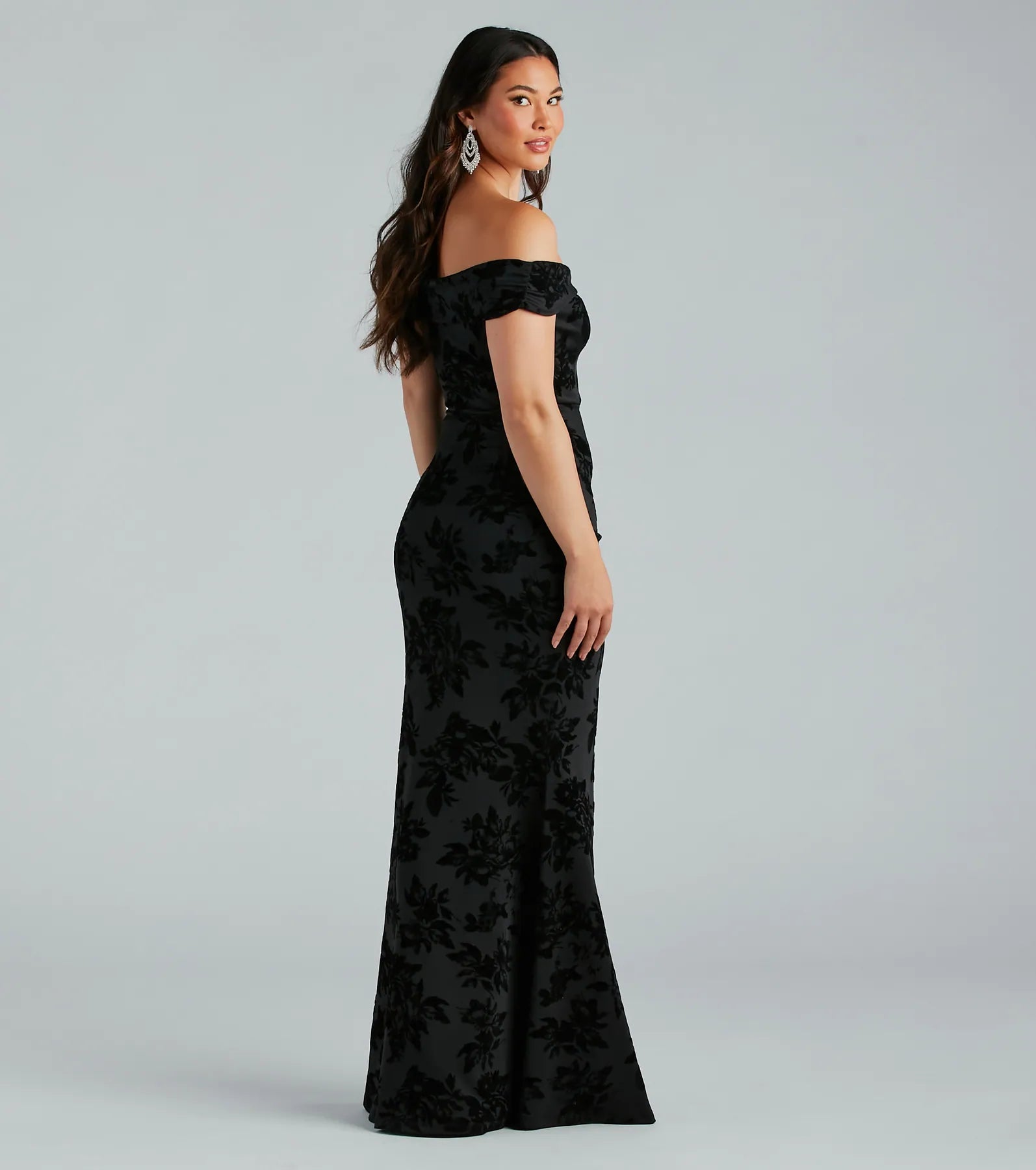 This Darcey formal dress creates a dazzling elegance to any black tie event. She features an off-the-shoulder. fold-over sweetheart neckline. short-sleeve cuffs. a flattering mermaid silhouette. a ruched front seam. and a stylish front slit along the floor-length hem. The formal dress is designed with a lovely flocked velvet pattern on smooth scuba knit fabric. Complete the look with dangly and heels.