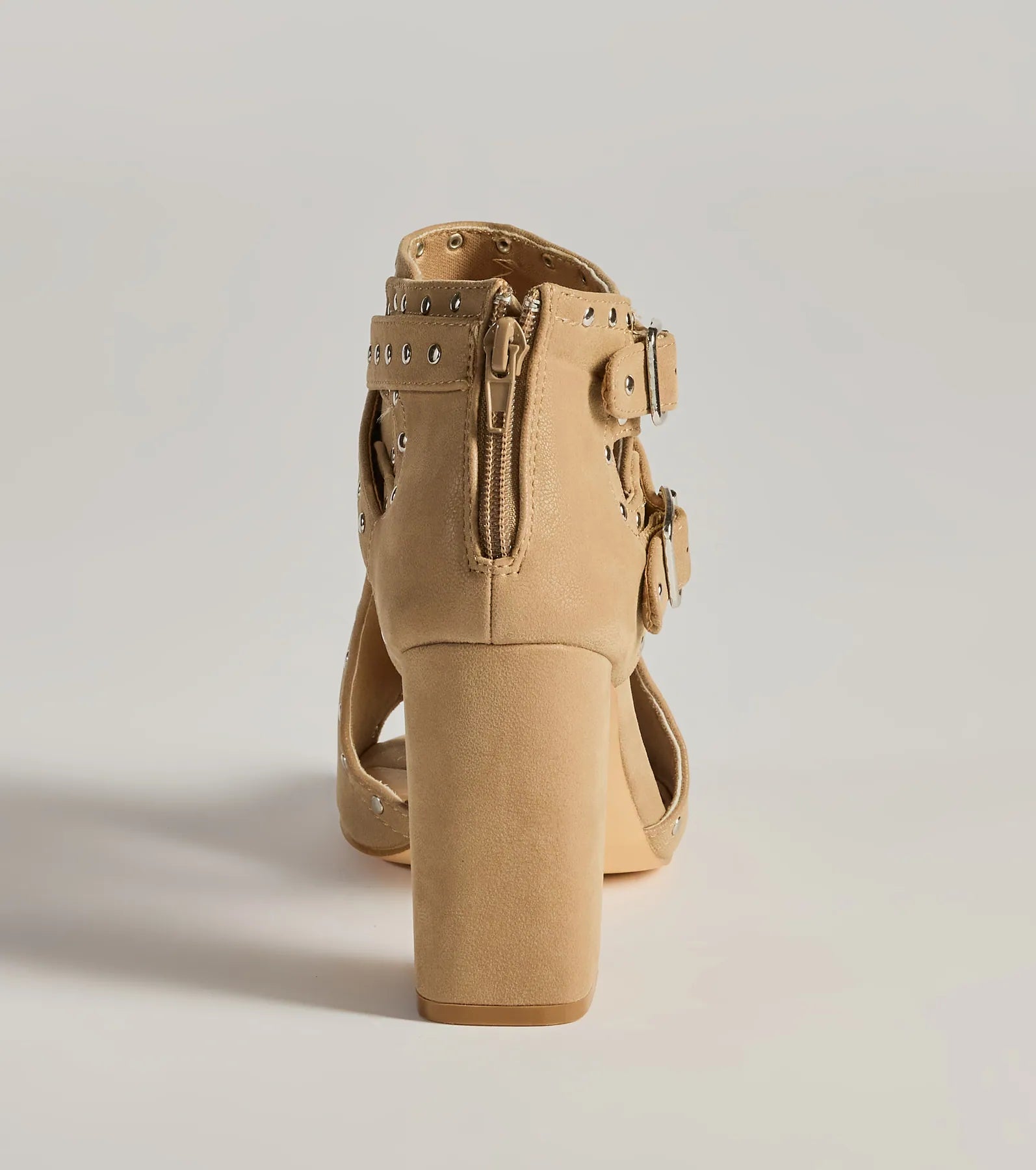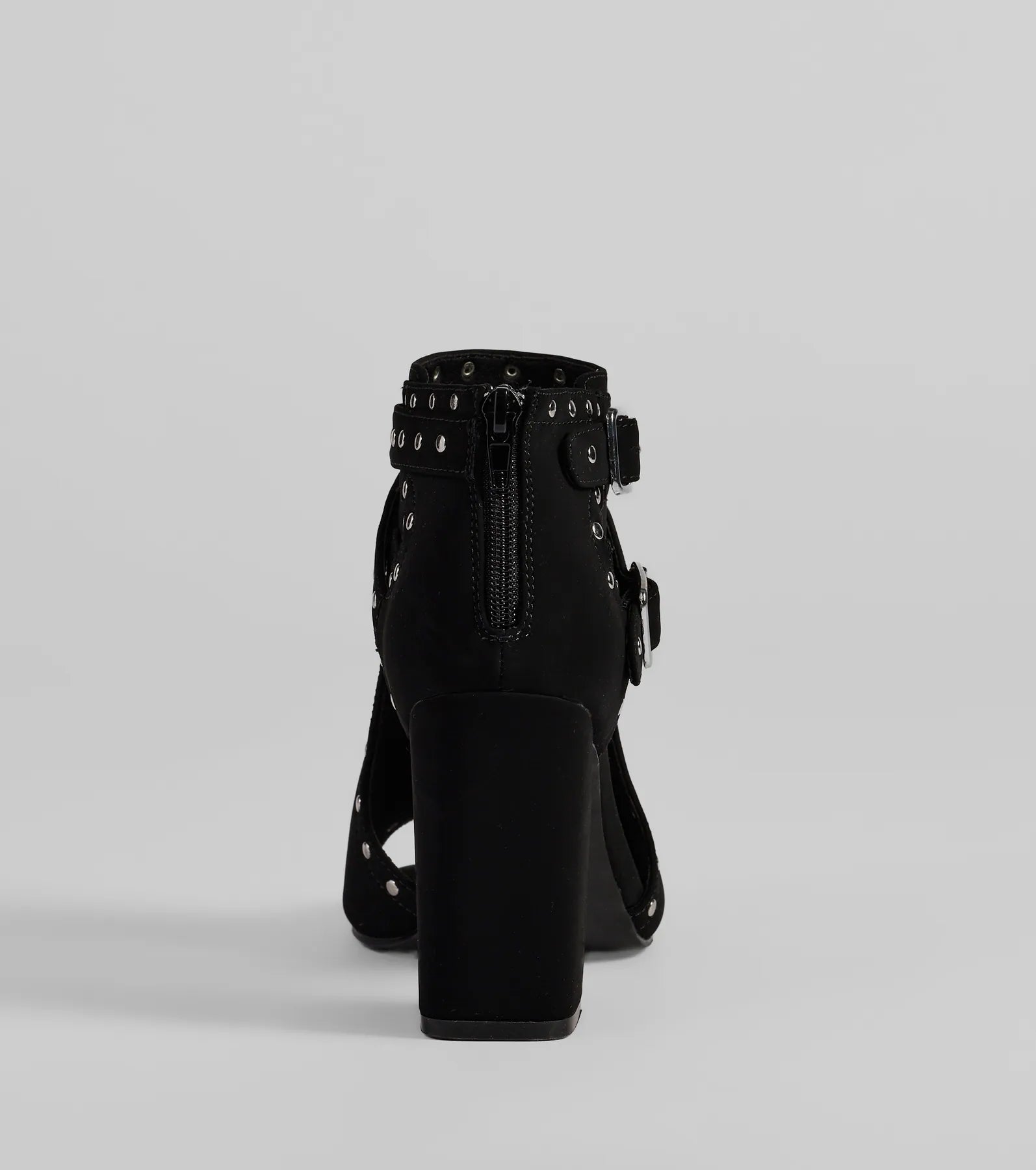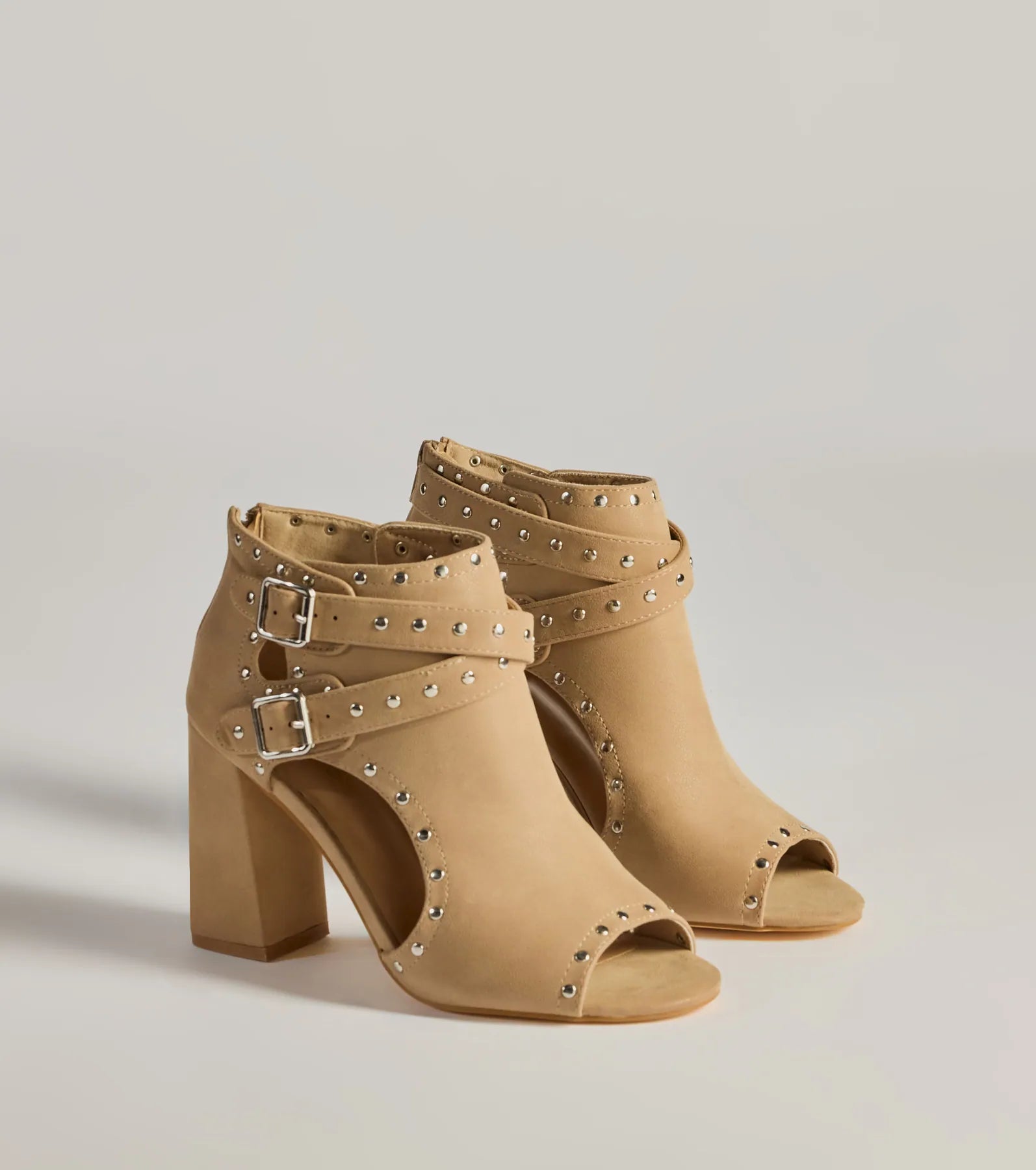 Make a bold statement with the daring details studded ankle booties. Featuring a block heel. peep toe. and criss-cross straps with metal buckles. these booties are your new go-to for standout style.