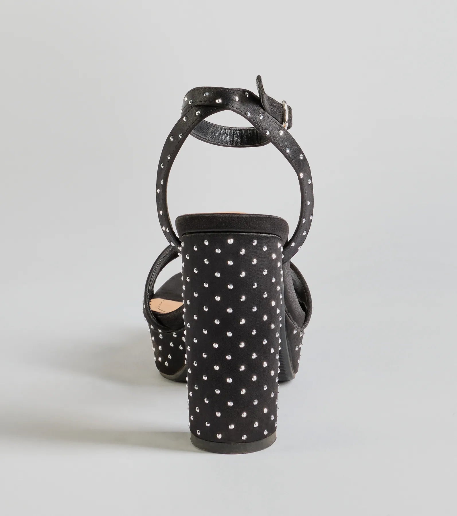 These satin heels feature a square toe. platform sole. and all-over rhinestone embellishments. Perfect for any semi-formal or special event.