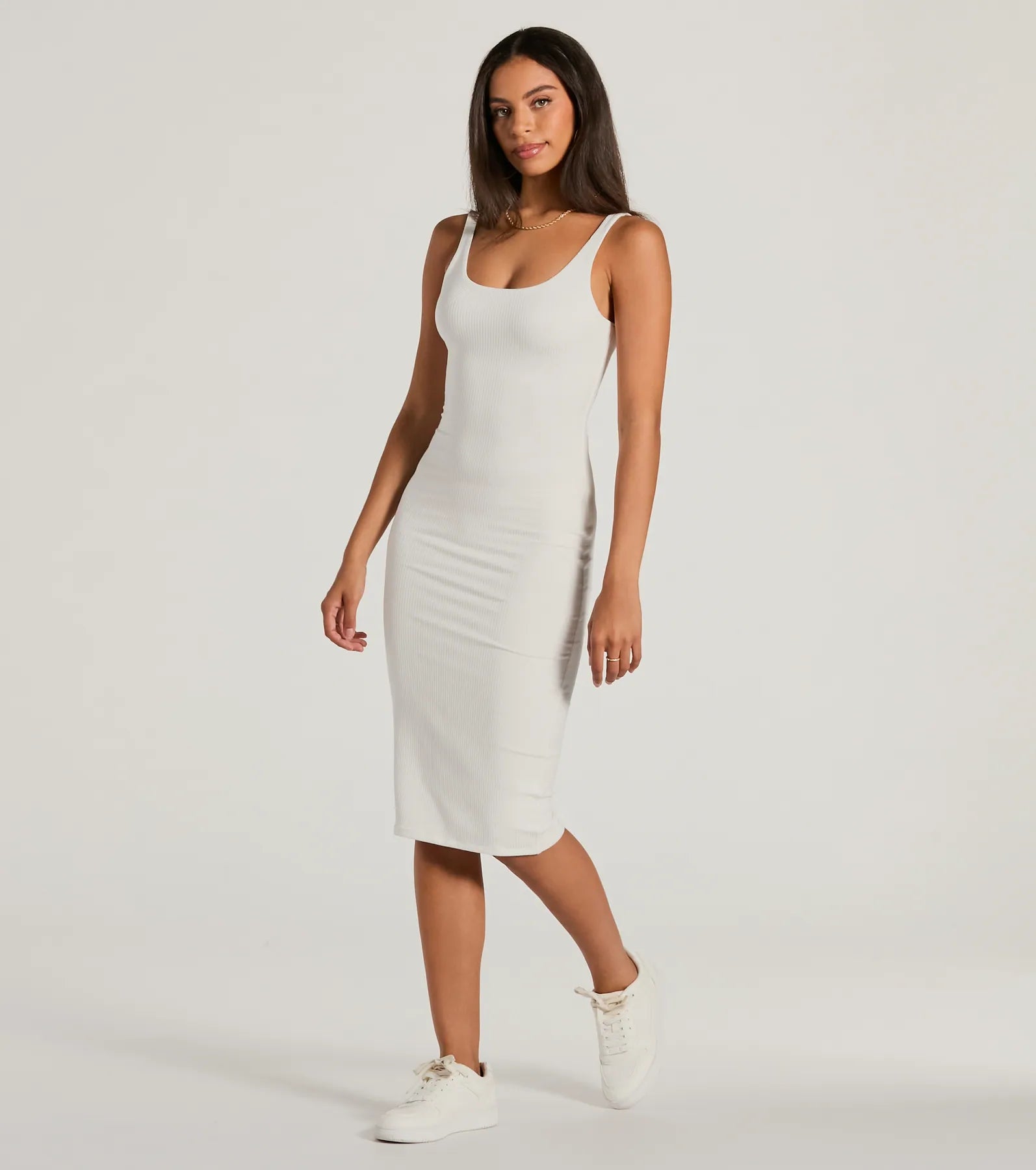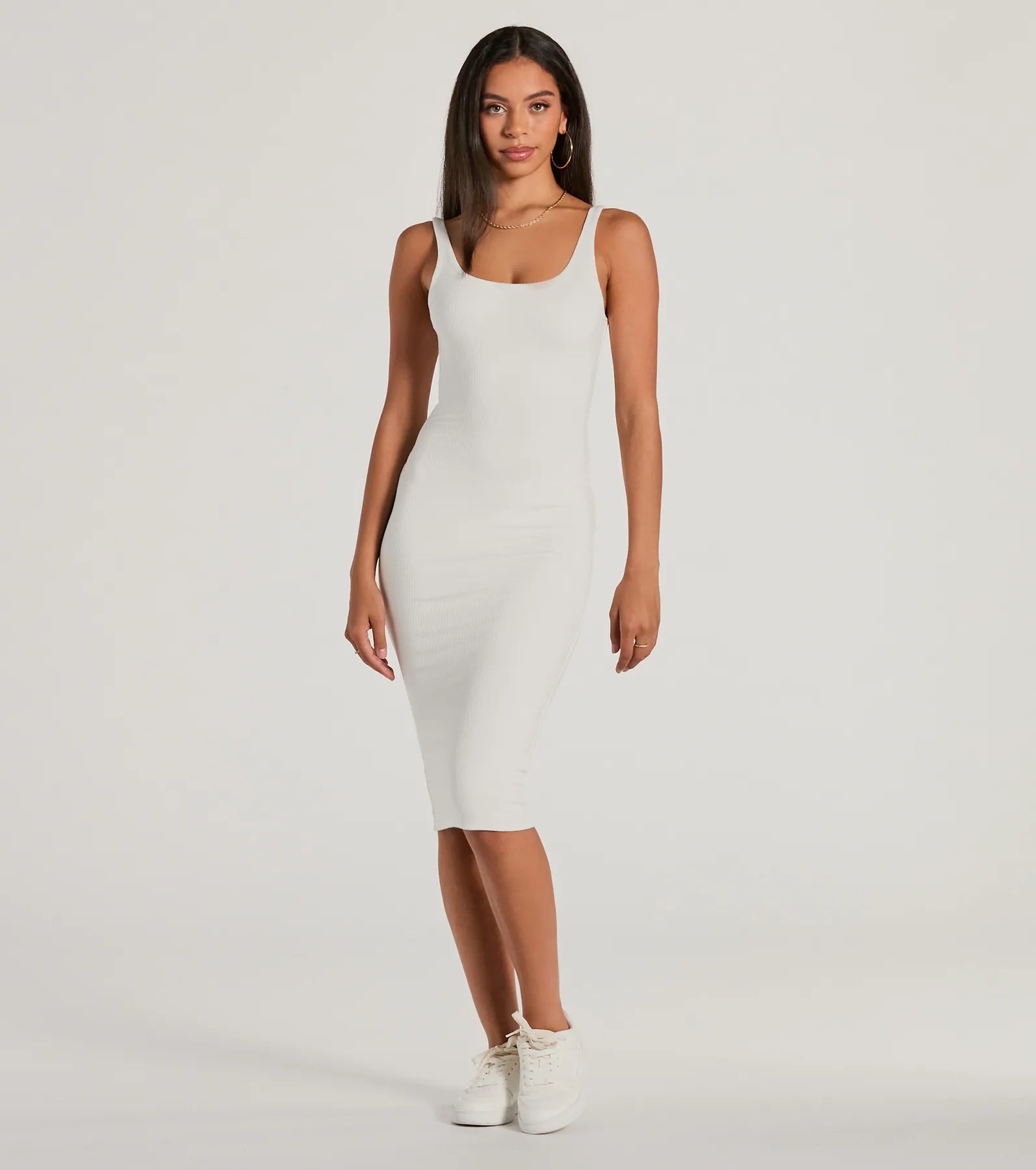 Be ready in a flash with this done-in-one bodycon midi dress perfect for styling up or down! Made with stretchy ribbed knit fabric. it’s also soft and comfortable to wear all day. It features a flattering scoop neckline and tank shoulder straps for a comfortable and stylish fit. With a bodycon silhouette and midi-length hem. this dress will hug your curves! Complete the look in a and sandals.