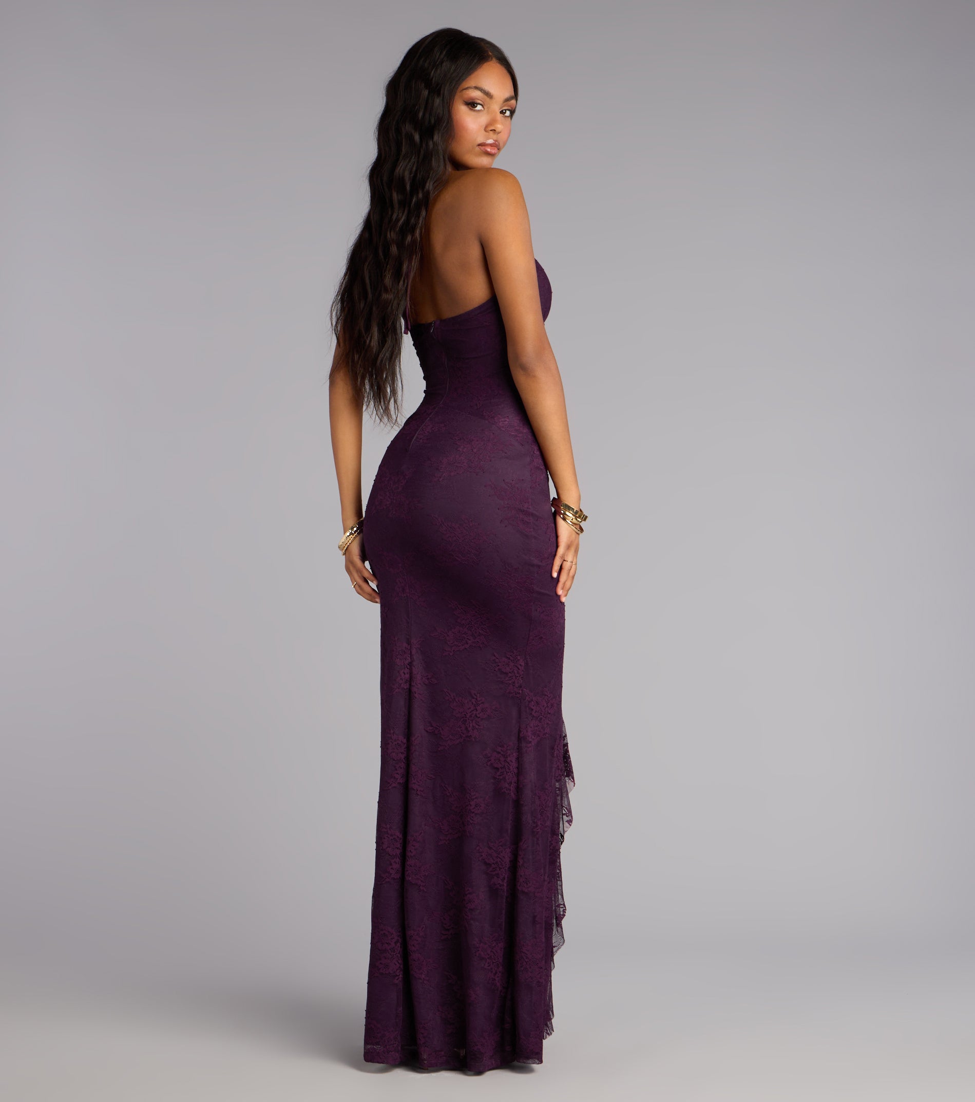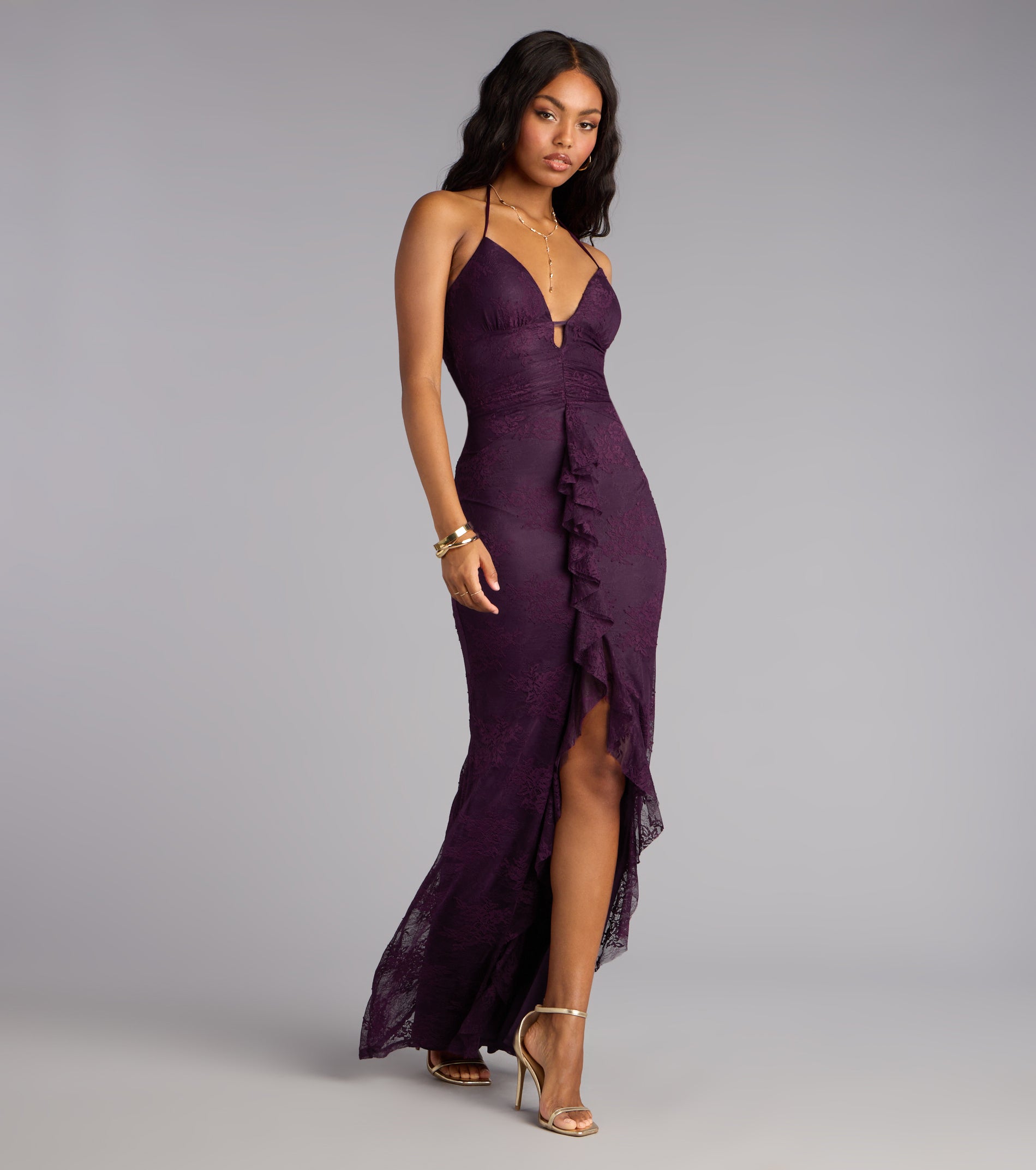 Romantic with a touch of drama. The Donna formal dress was made for unforgettable entrances. Crafted from delicate lace in a curve-hugging mermaid silhouette. this gown stuns with a deep V-neckline and cascading ruffle along the high front slit—soft. striking. and made to move beautifully with you.