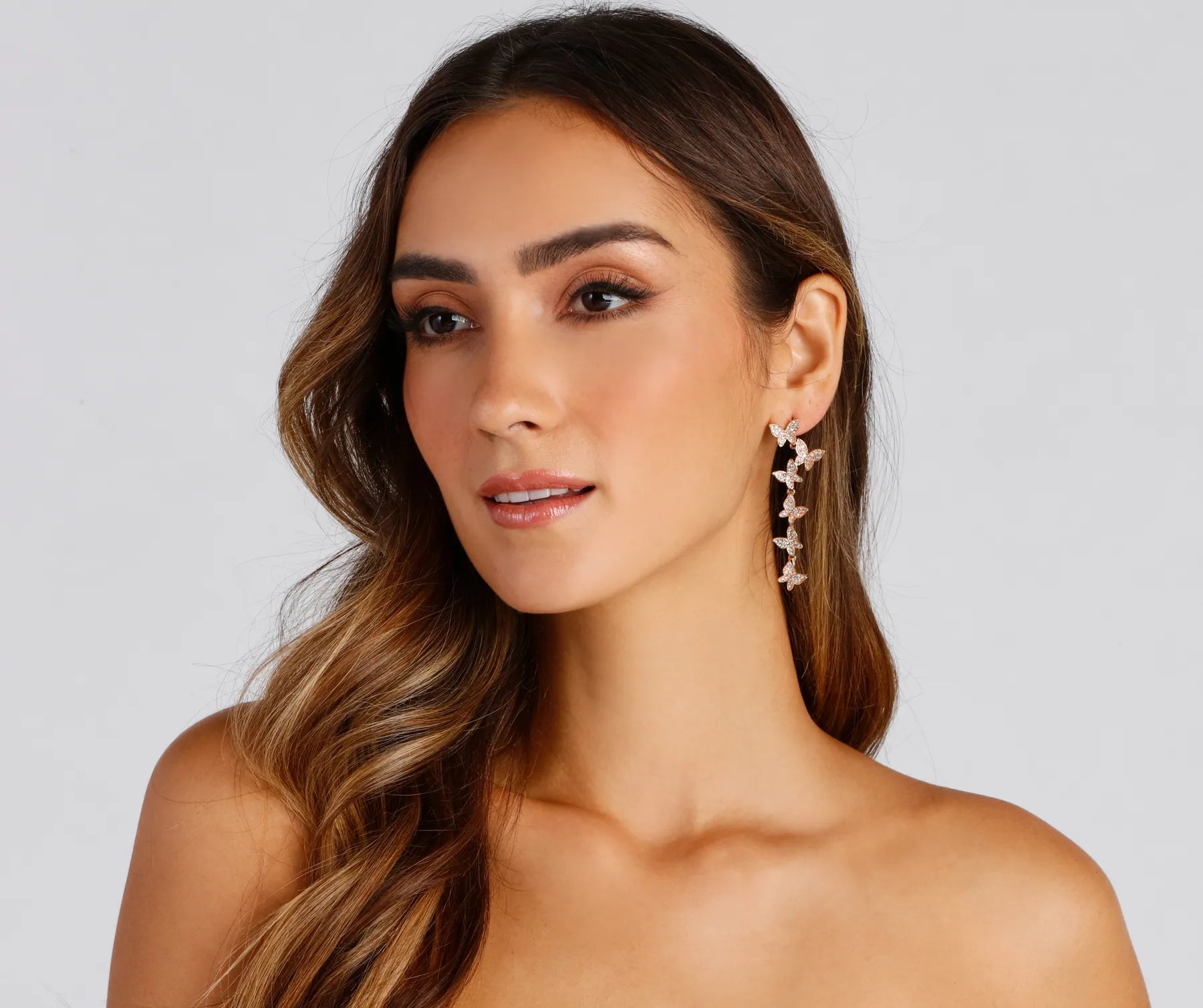 Accessorize with these gorgeous earrings for a dreamy vibe! They feature a cascading linear design with butterfly charms with iridescent mini rhinestone embellishment. Complete the look with a trendy .