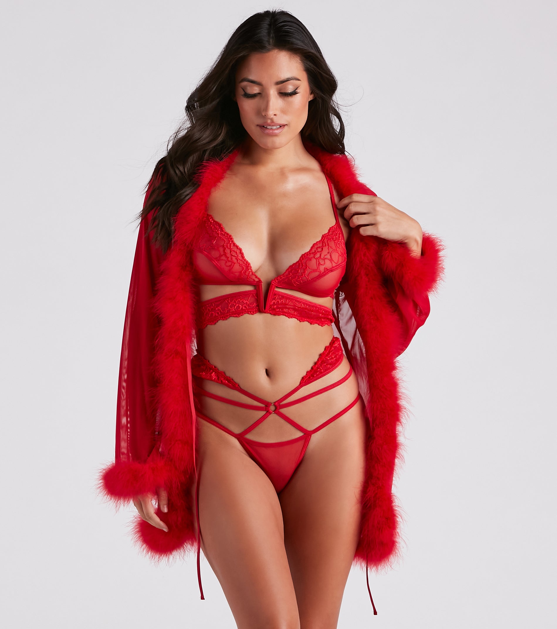 Put your curves on display in this lace bra and panty lingerie set! Make them swoon for you in this sexy bra featuring a plunging neckline. adjustable spaghetti straps. and a V-wire insert with a lace band that leads to the strappy back design and a tie closure. The high-rise thong panties feature strappy sides. a lace trim that shapes the strappy back. a front O-ring accent. and a cute heart accent at the back.?The stretchy sheer mesh fabric features an adorable all-over heart pattern. Complete the look with flutter false lashes.