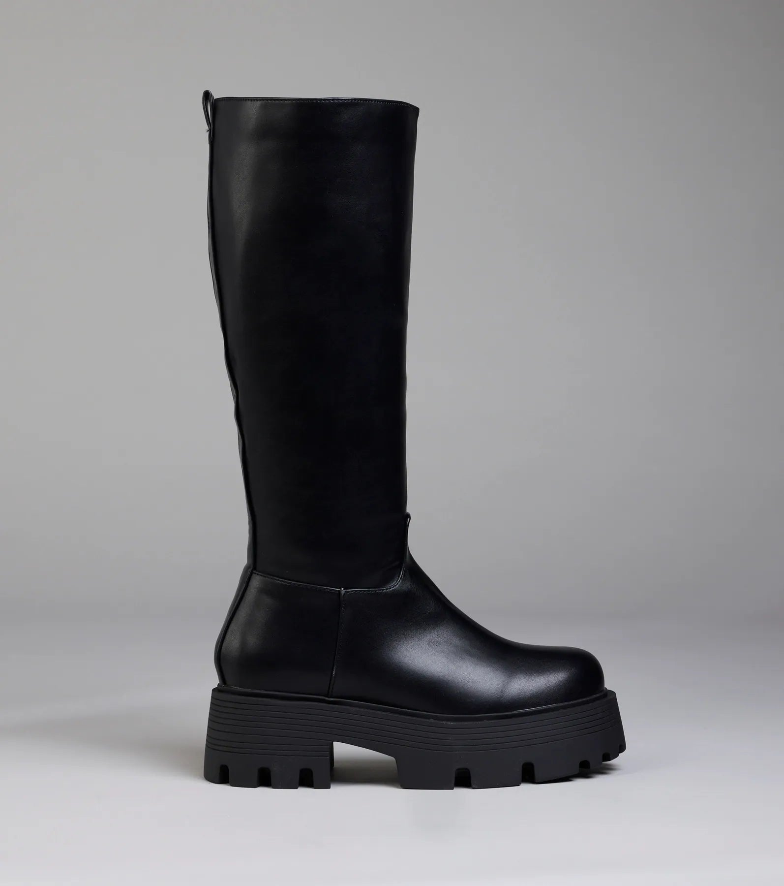 An absolute edgy essential. these faux leather boots elevate your outfit with a platform lug sole and under-the-knee length shaft. perfect for styling with jeans or a skort!