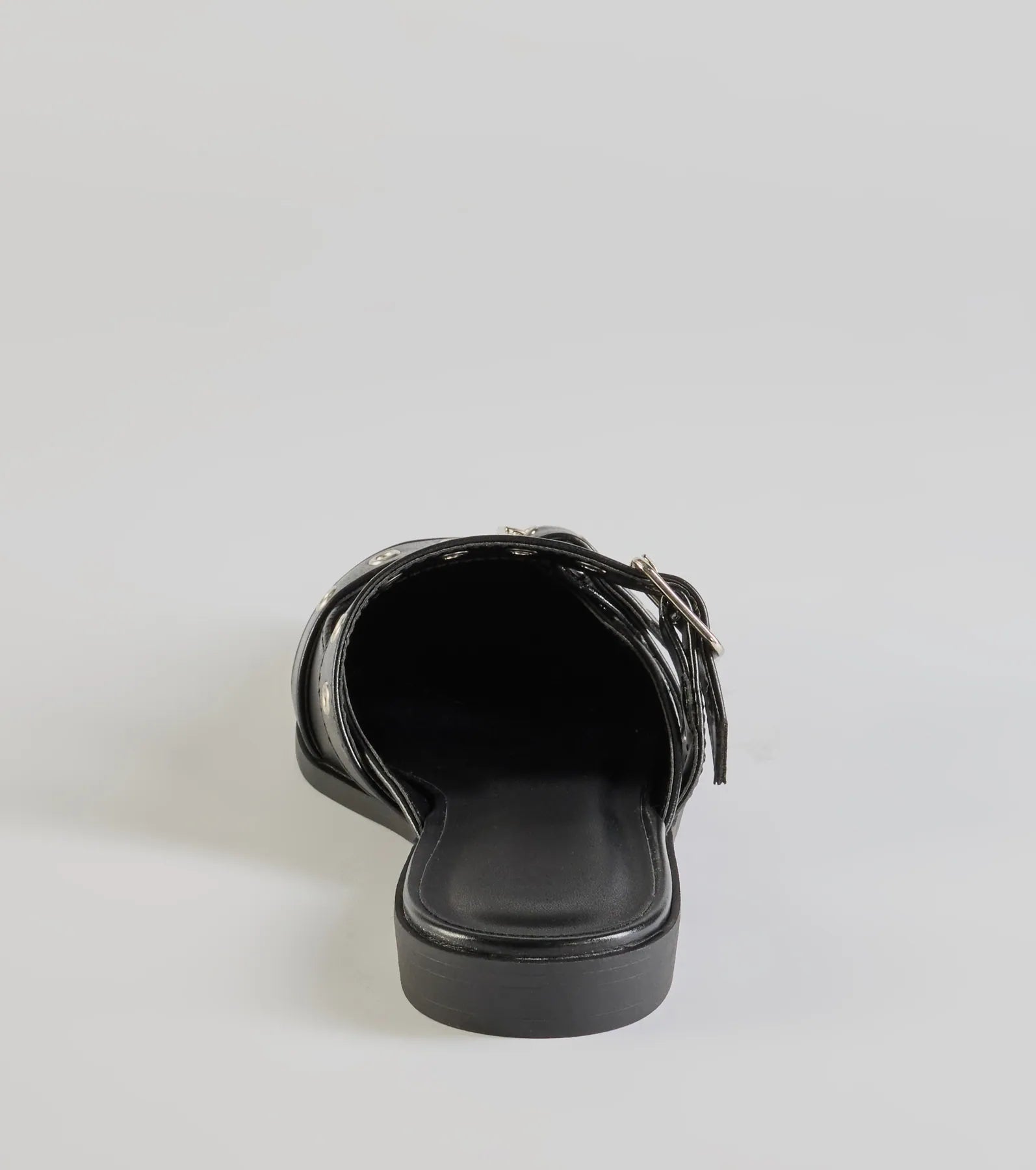 Add an edgy flair to your fall ‘fits with these faux leather flats featuring a closed pointed toe. dual buckle straps. and an open back for effortless on-and-off styling. Pair with a chic shoulder bag.