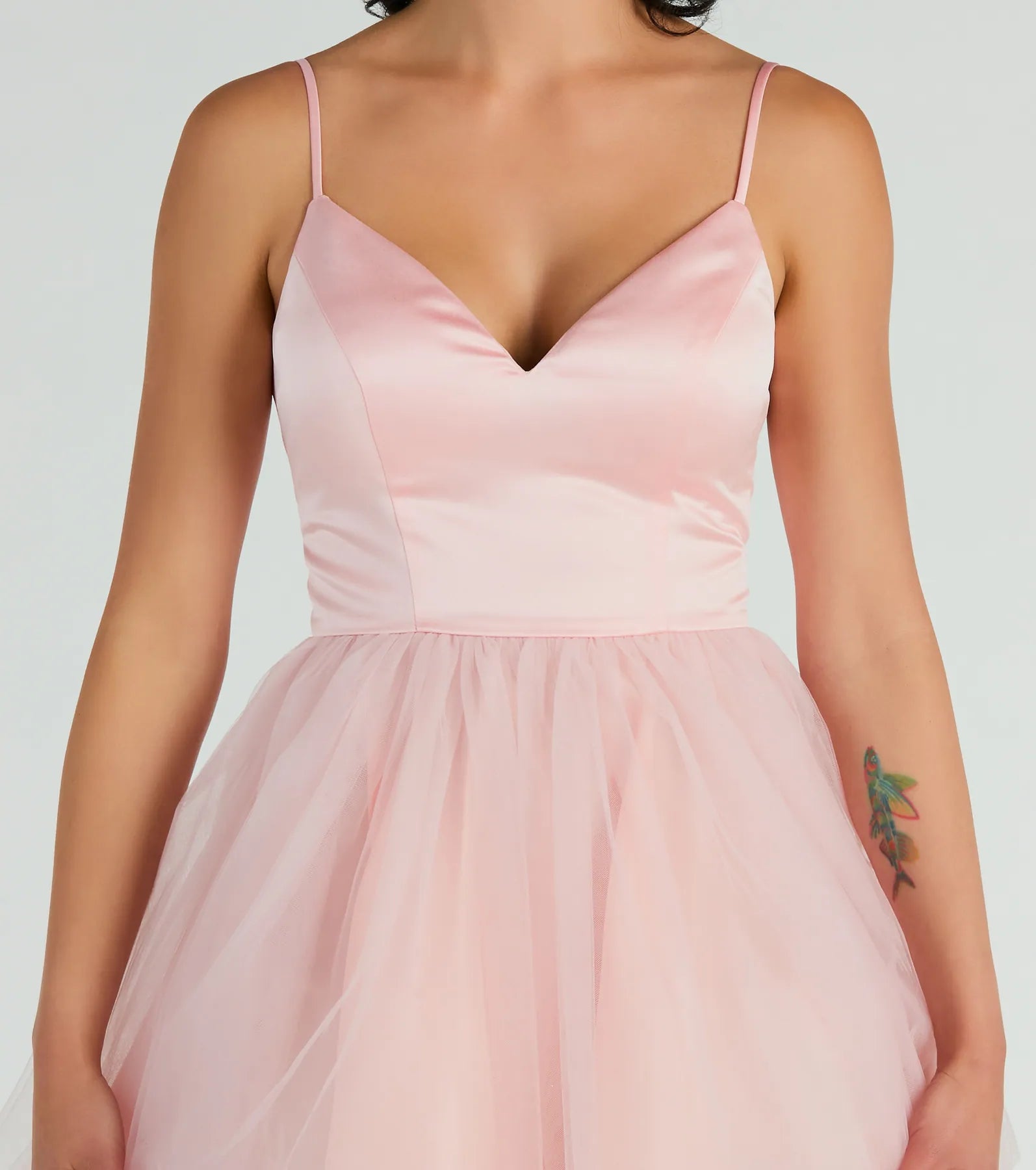 Pirouette into the room in the Edith satin tulle party dress as the adorable birthday girl or party guest! The flattering V-neckline with padded bra cups and low-cut back adds a touch of sophistication. The skater silhouette and tulle short-length hem create a flirty and playful look. Complete the look with . and heels!