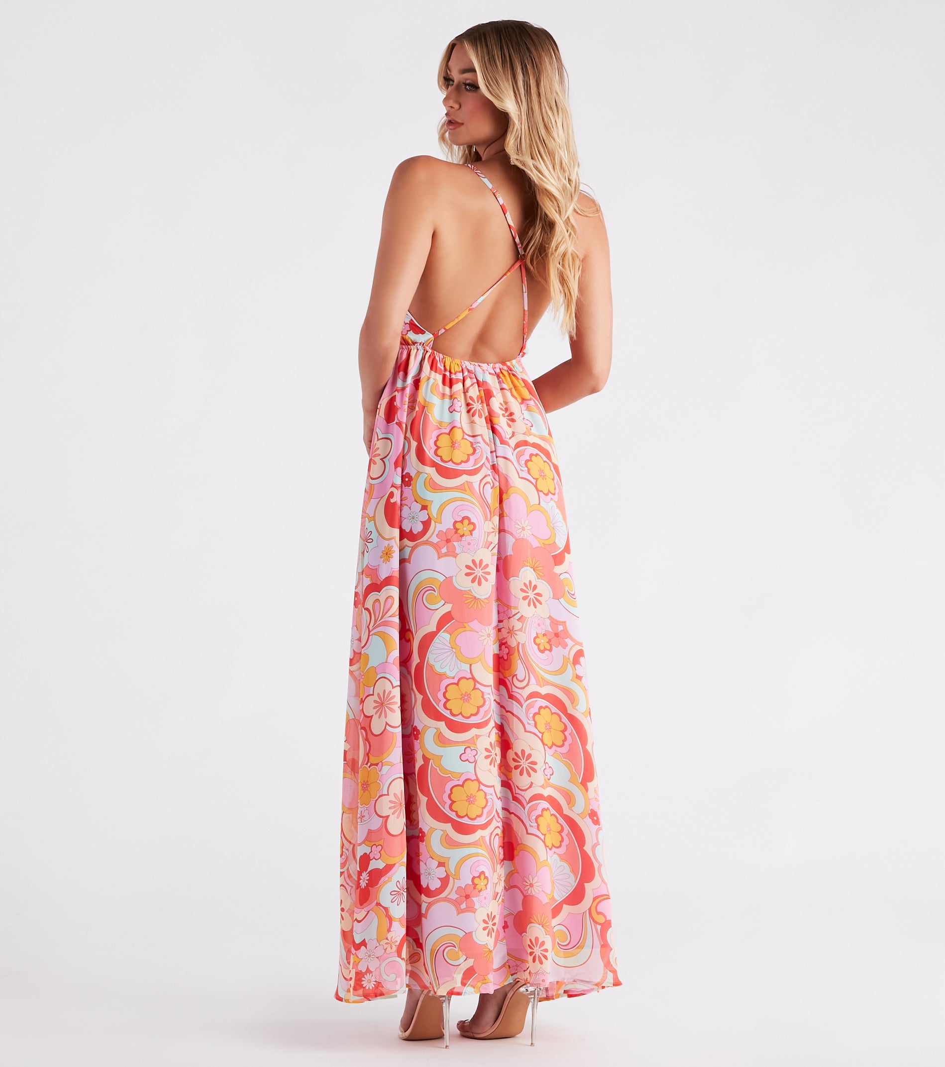Look absolutely electric in this 70s-inspired chiffon maxi dress at parties and vacations! It features a sleeveless V-neckline. adjustable spaghetti straps that cross along the open back. an empire waist. and a flowy maxi-length silhouette on floral print chiffon fabric with a smooth woven lining. Complete the look with a sleek and heels.