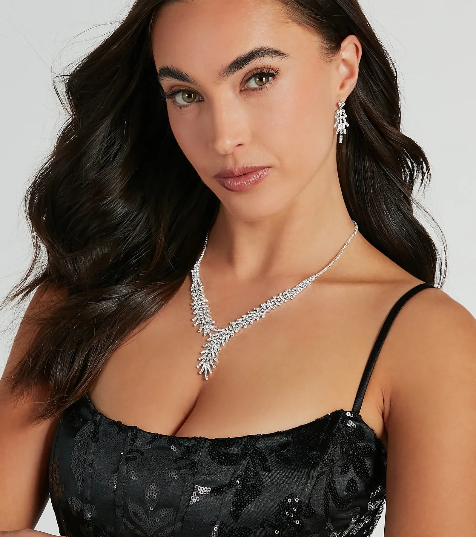 - Matching rhinestone necklace and earrings set