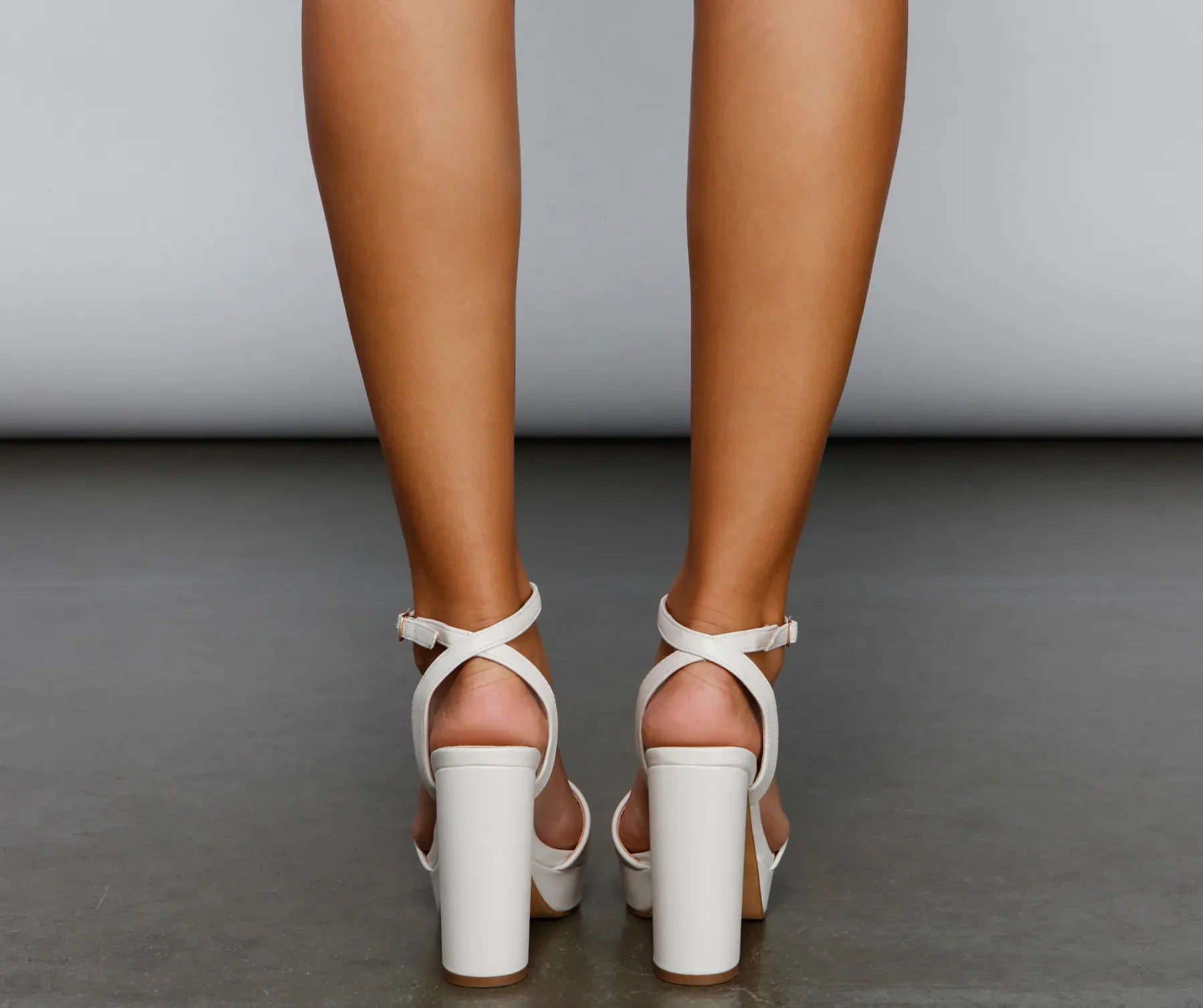 Showcase an elevated glam style with these fab faux leather heels. They feature an open almond-shaped toe. a wide toe strap. a thin adjustable ankle strap. a platform. and a tall block heel. Complete the look with sleek .