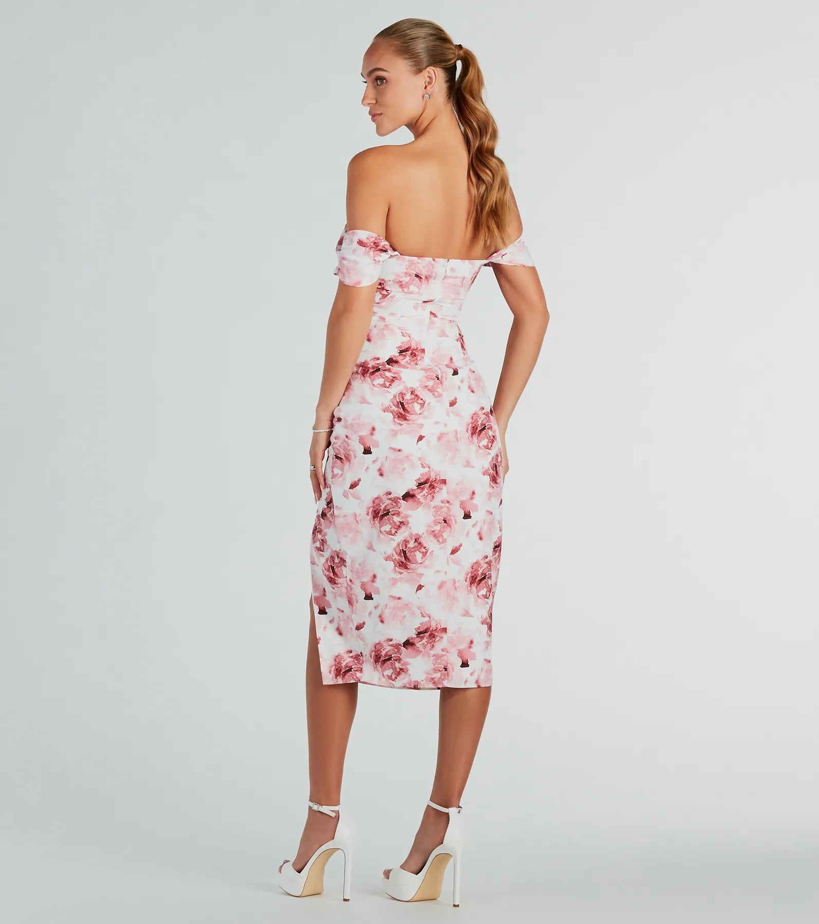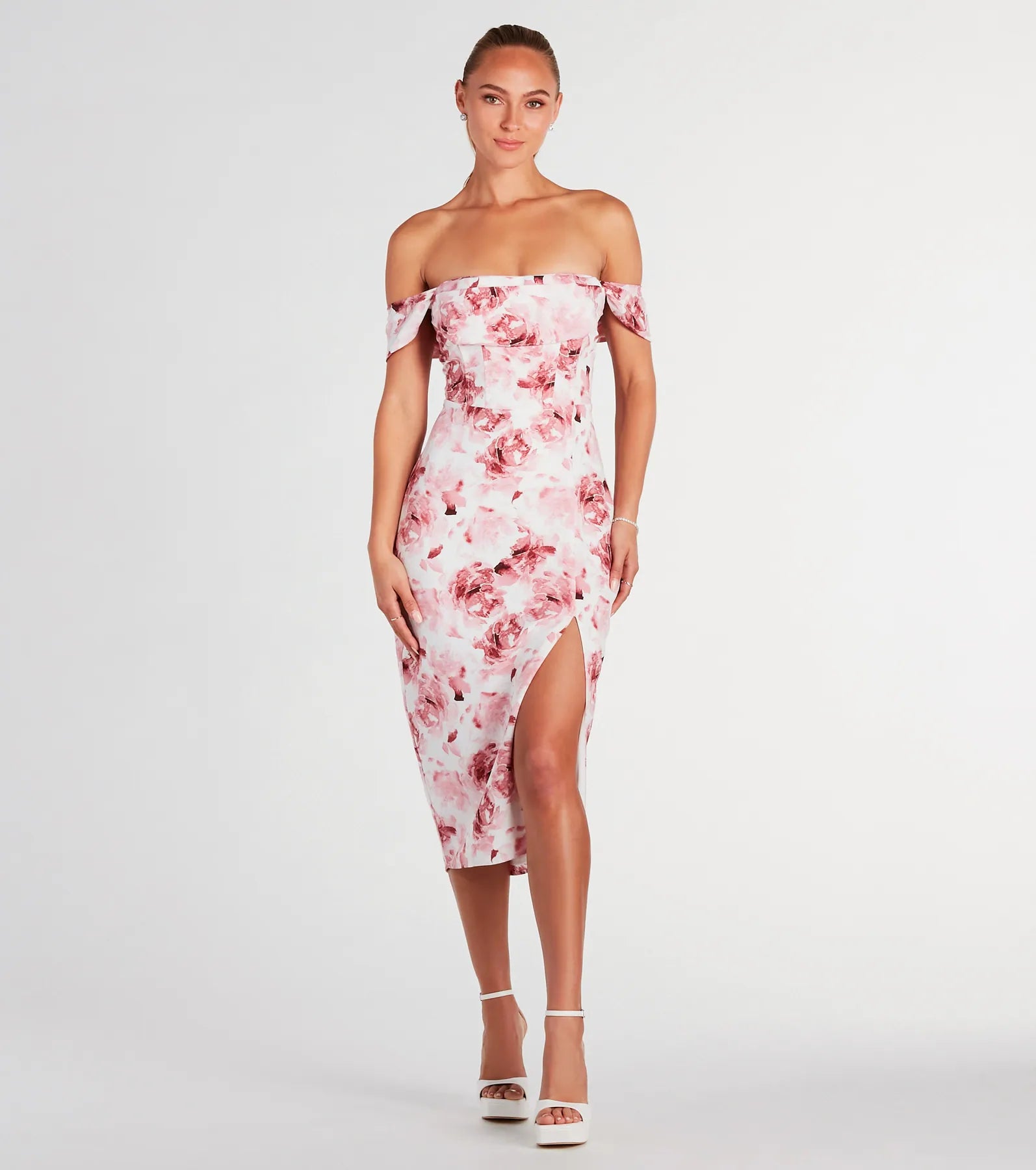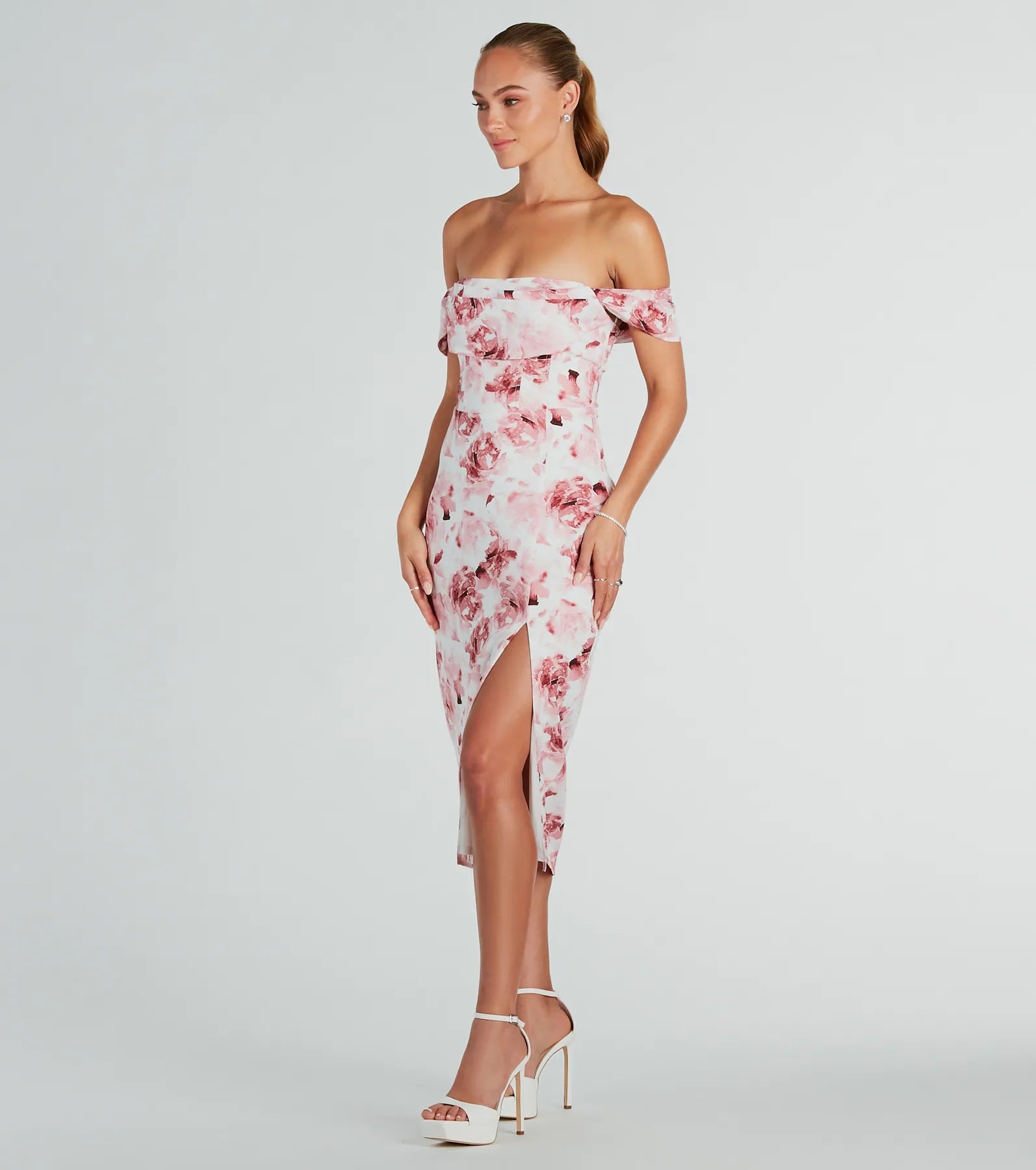Enchanting blooms romance this floral linen midi dress plus your date and party guests! Classy and chic. this midi-length dress features a romantic off-the-shoulder cowl neckline. short-sleeve cuffs. and flexible boning inserts for a structured fit. With theĀ form-hugging silhouette and front slit. this dress is also perfect for showing off your curves! Style with sleek and a clutch.
