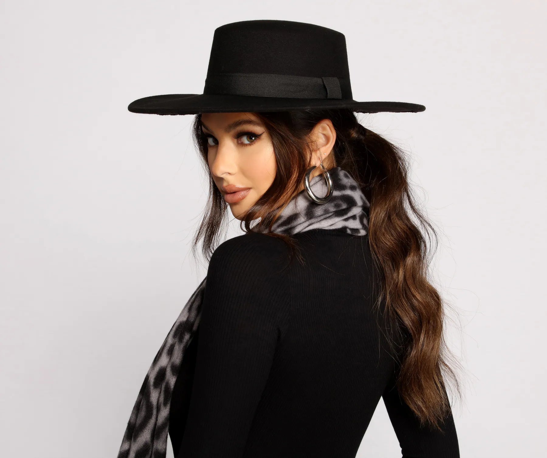 Add a trendy vibe to your fall and winter ‘fit with this chic boater hat! It features a traditional boater design with a stylish ribbon band. Wear this hat with a and .