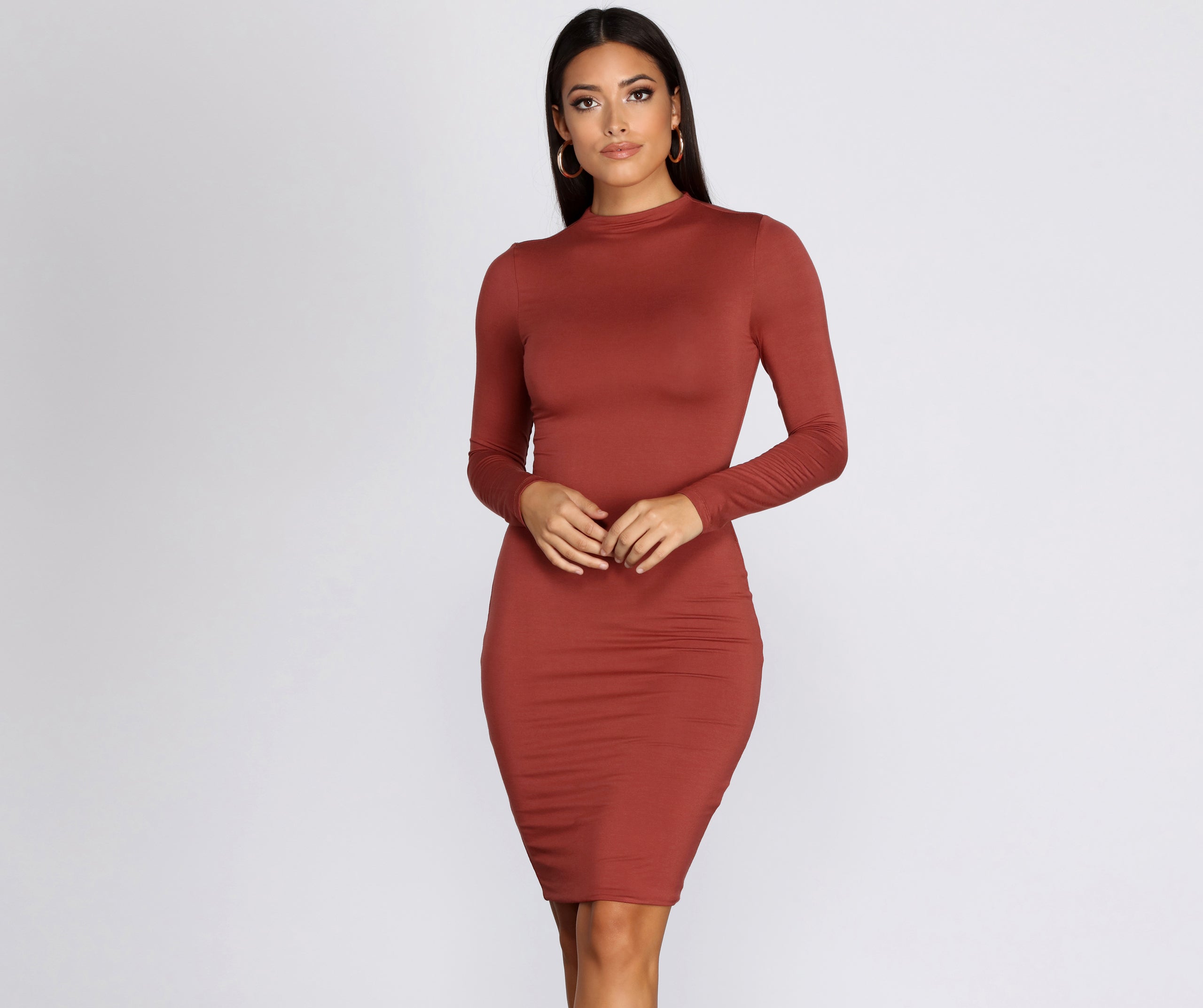 Fall into the season with trendy knit to make an effortlessly chic look! The dress features a crew neck. fitted long sleeves and a midi length silhouette. Dress is composed of a double lined brushed knit fabric that offers a form hugging fit with a moderate stretch.
