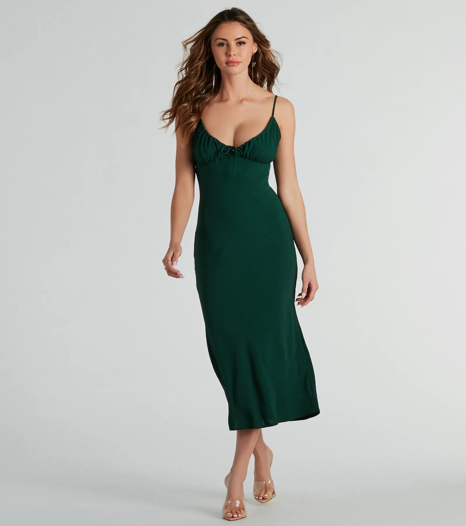 Once you find this sleeveless midi dress you’ll want to keep it! Perfect for semi-formal occasions. this midi dress will make you feel chic and effortless. Designed with an adjustable V-neckline with a bust tie. sleek spaghetti straps. and a flattering curve-hugging silhouette that exudes charm. Complete the look with a and strappy stilettos!