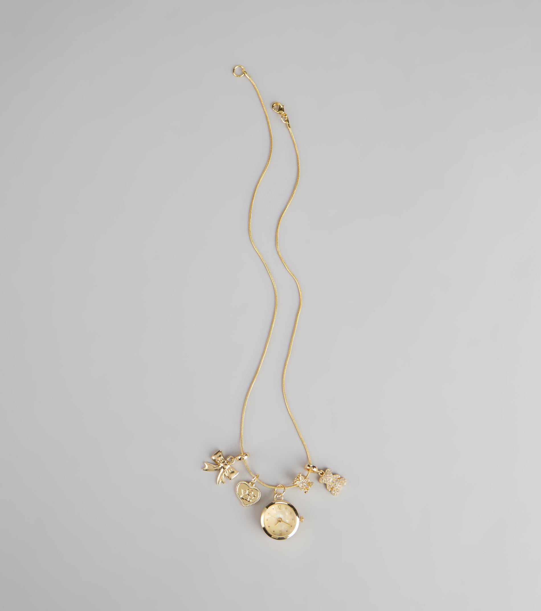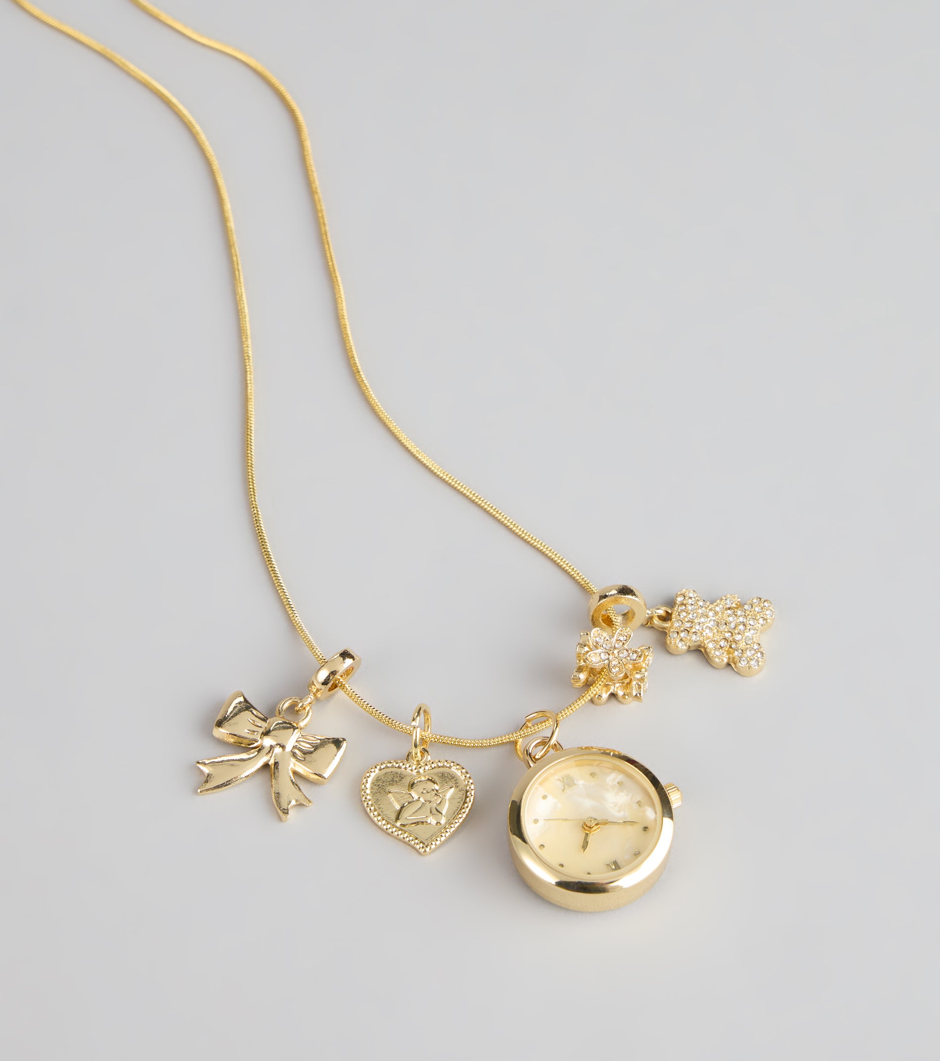 A playful mix of charms brings whimsical energy to this chain necklace. featuring a dainty bow. heart. teddy bear. flower. and a mini watch pendant that keeps time stylishly. Perfect for layering or wearing solo. it’s a unique piece that blends function with flair.