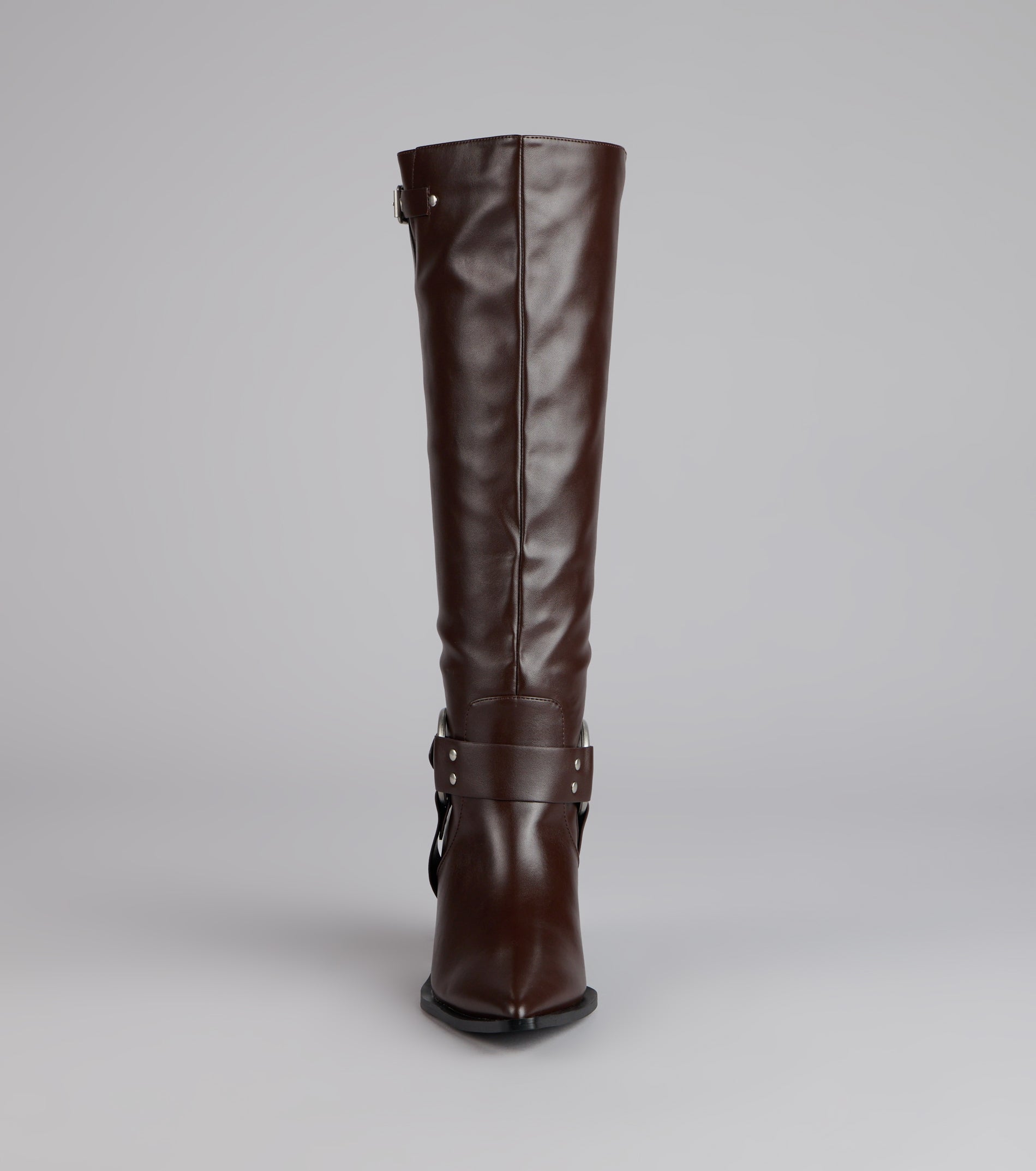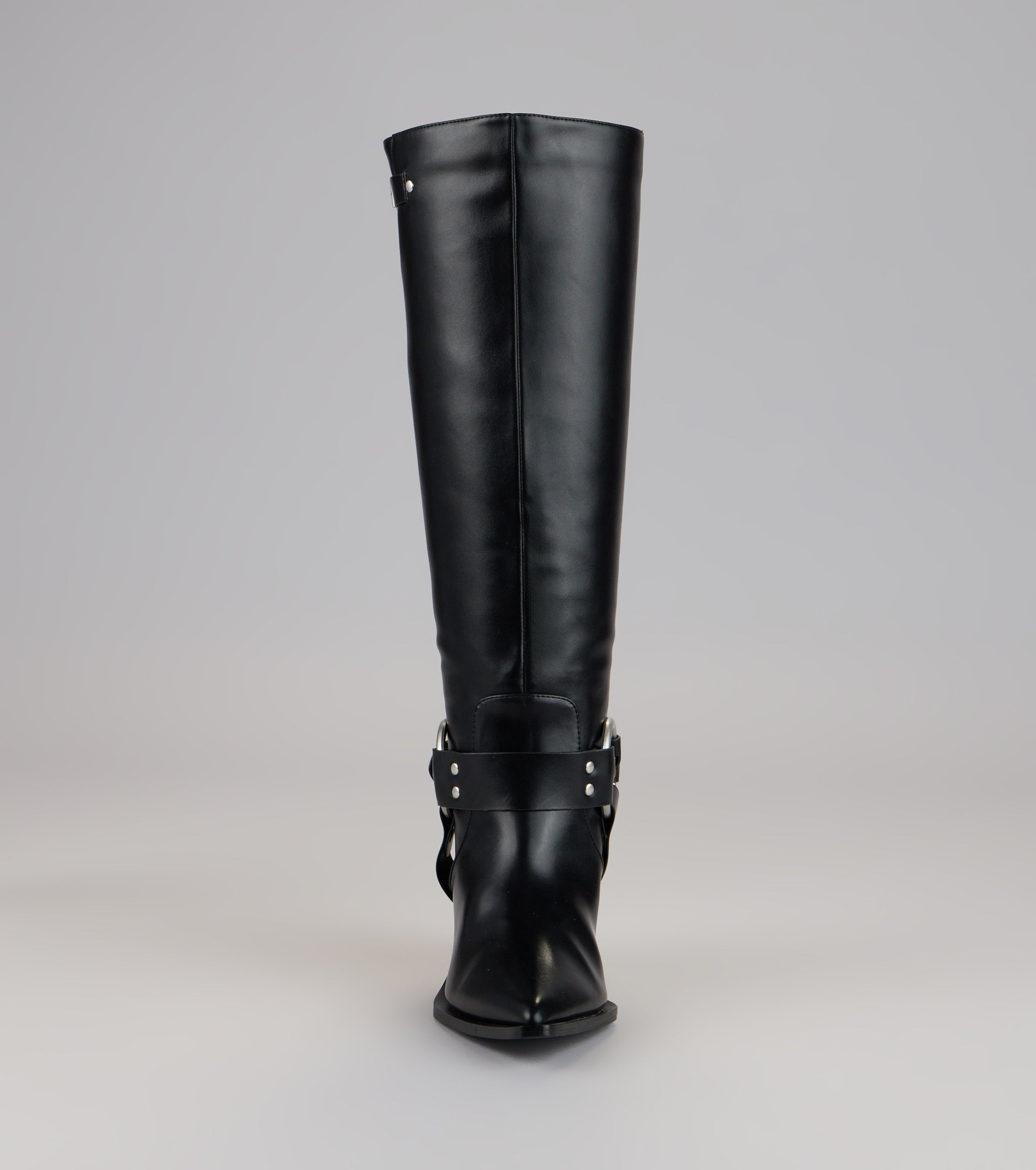Bring the western energy into your fall lineup with these knee-high boots. Featuring harness buckle detailing. a pointed toe. and a block heel. they bring western flair to a city chic vibe. perfect for styling with any look.