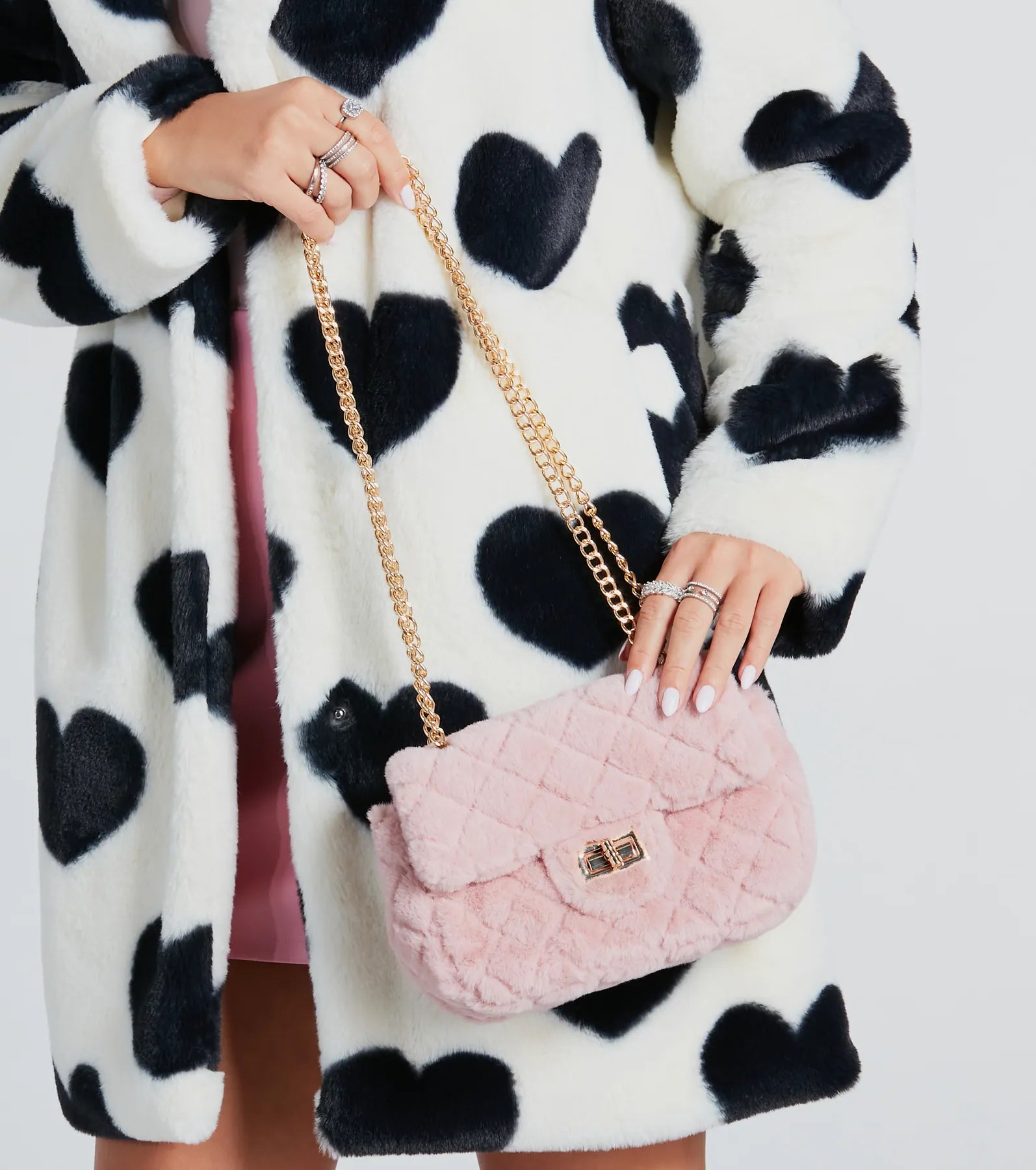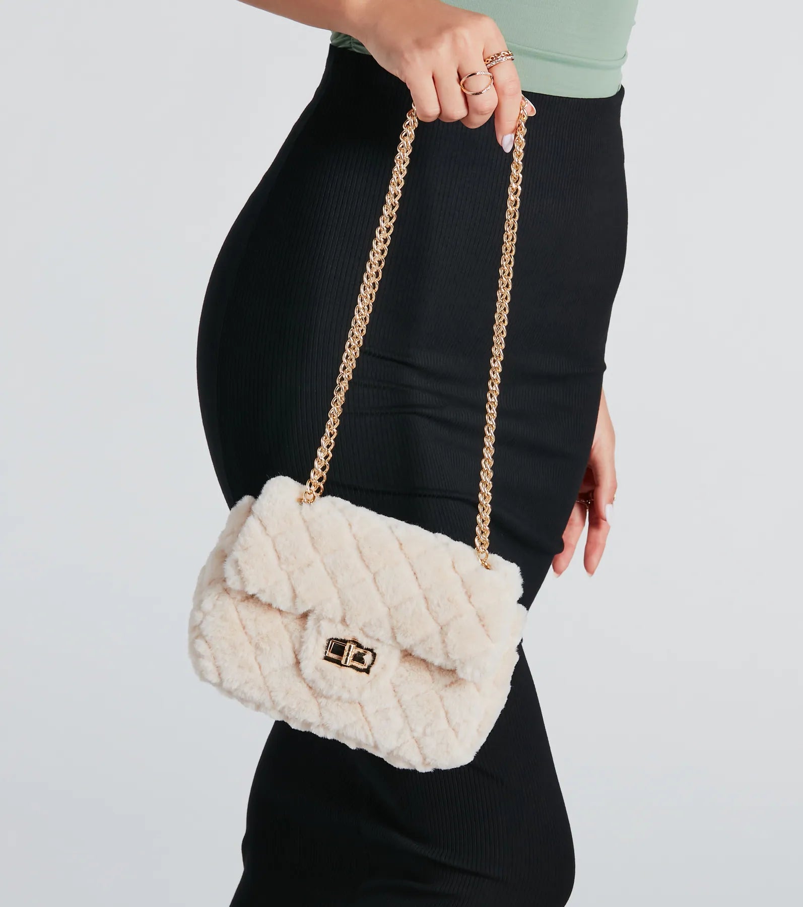 Look fashionable and fab with this faux fur crossbody bag! This quilted bag features a stylish chain shoulder strap. a front flap with turn-lock closure. and a spacious woven lined interior. Elevate any outfit with this must-have bag and sultry !