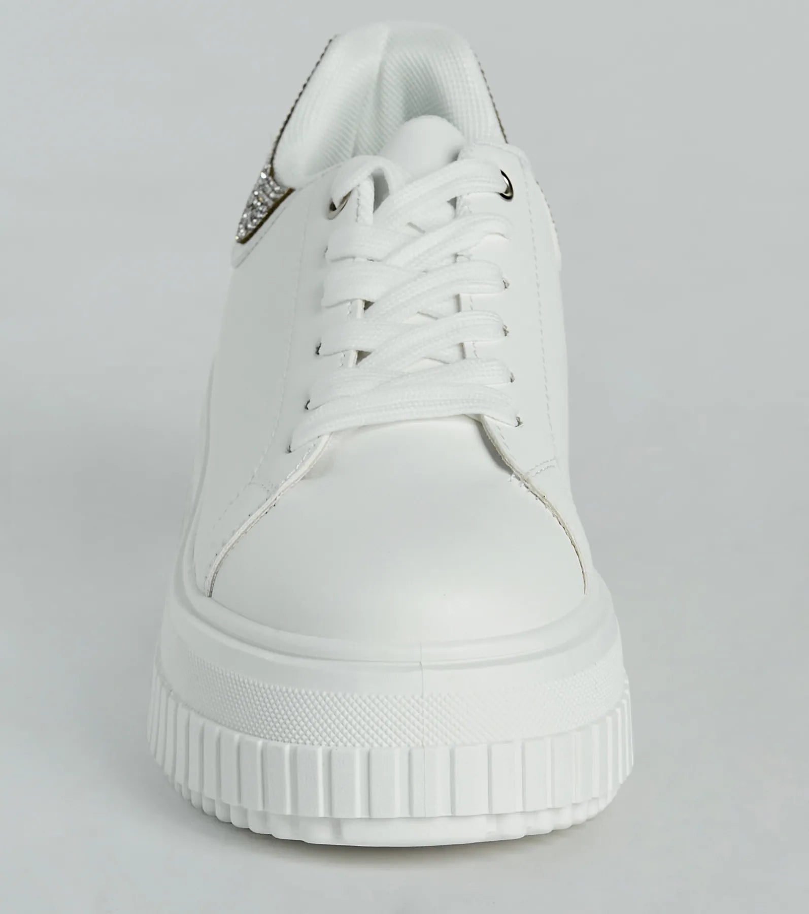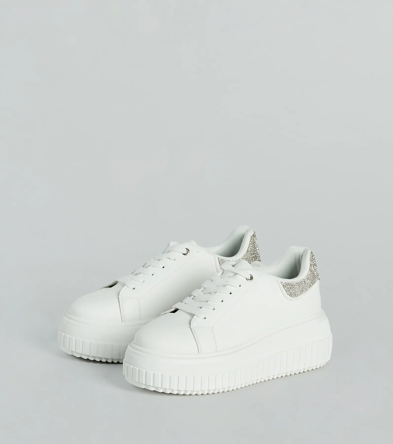 Get your glam girl sparkle on in these faux leather rhinestone sneakers! Featuring a round toe and lace-up placket. these sneakers are both stylish and comfortable. The chunky platform sole adds height and the rhinestone embellished heel trim adds a touch of sparkle. Complete the look with a trendy .
