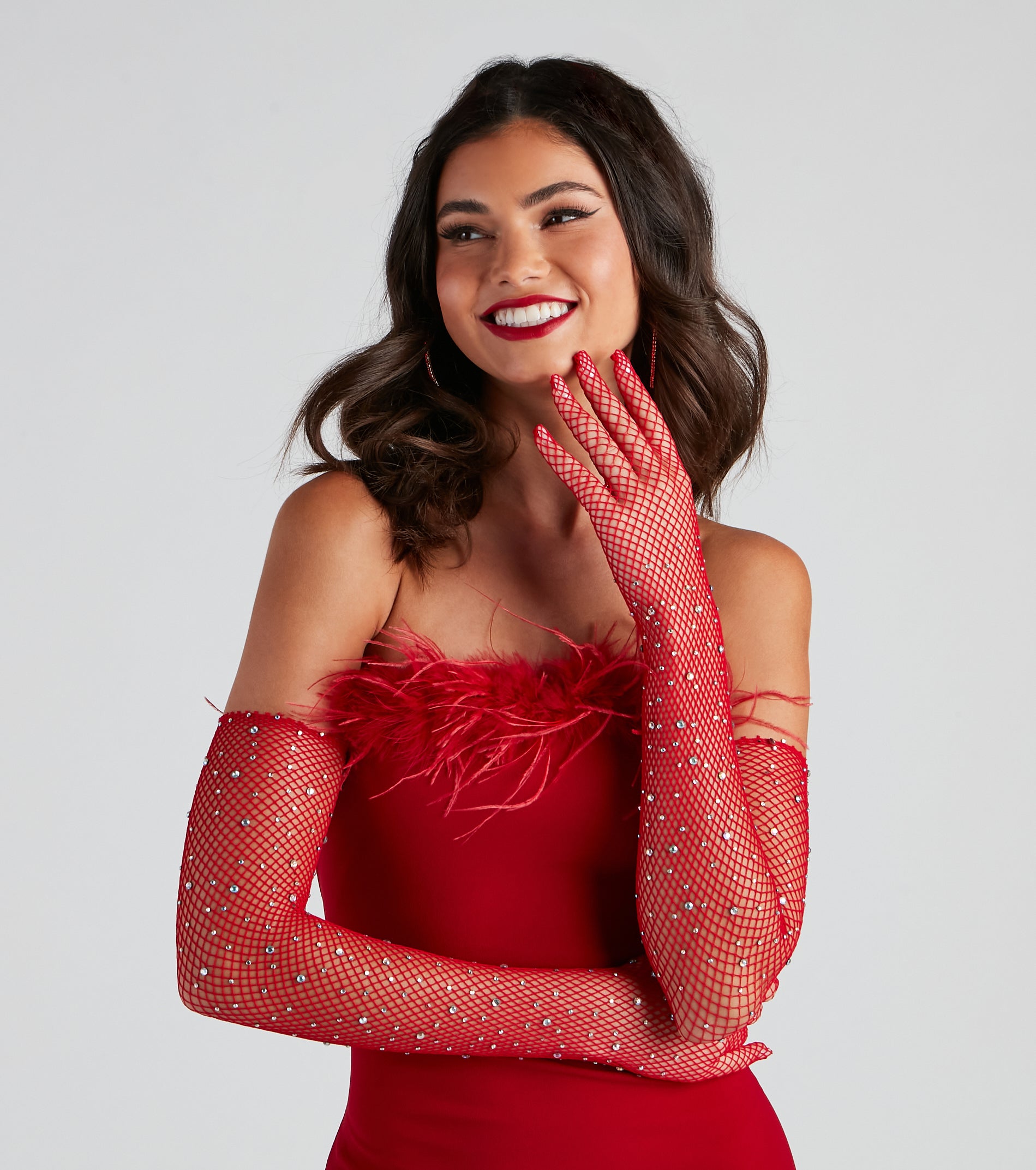 Bring a glamorous sparkle to your outfits with these embellished gloves! They feature a small gauge fishnet design with all-over mini rhinestones with a pretty iridescent hue. Style with a  and over-the-knee boots to complete your look!