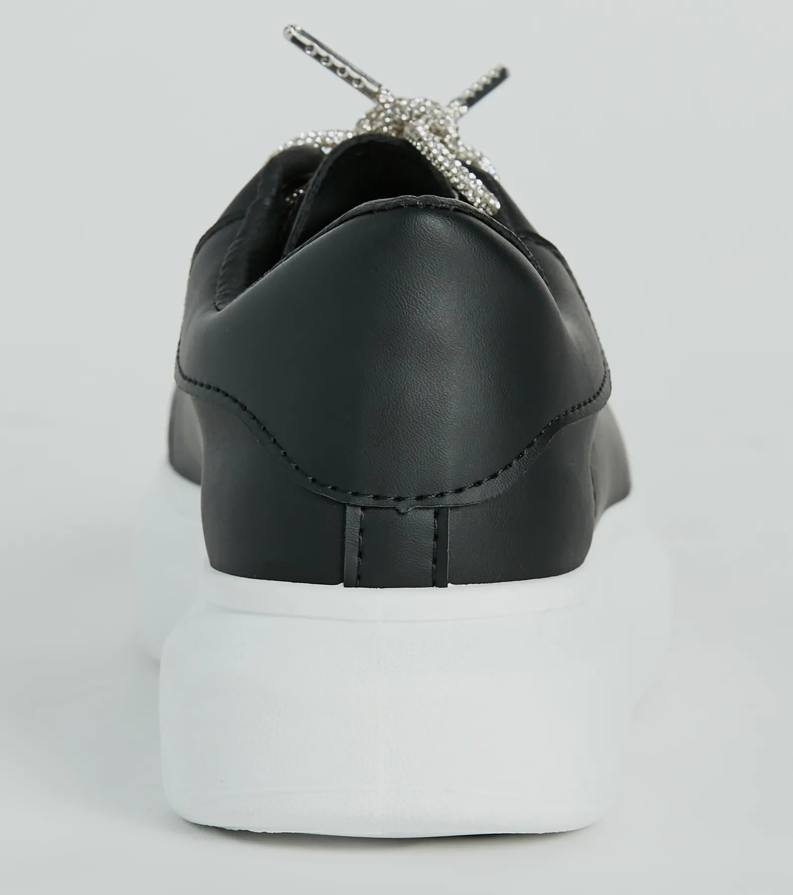 Make any outfit shine in these fashion sneakers! With a round toe. rhinestone embellished lace-up placket and tongue. a platform rubber sole. and a sleek faux leather upper. these sneakers are perfect for stepping out with your glam squad. Complete the look in a to elevate your style for day or night plans!