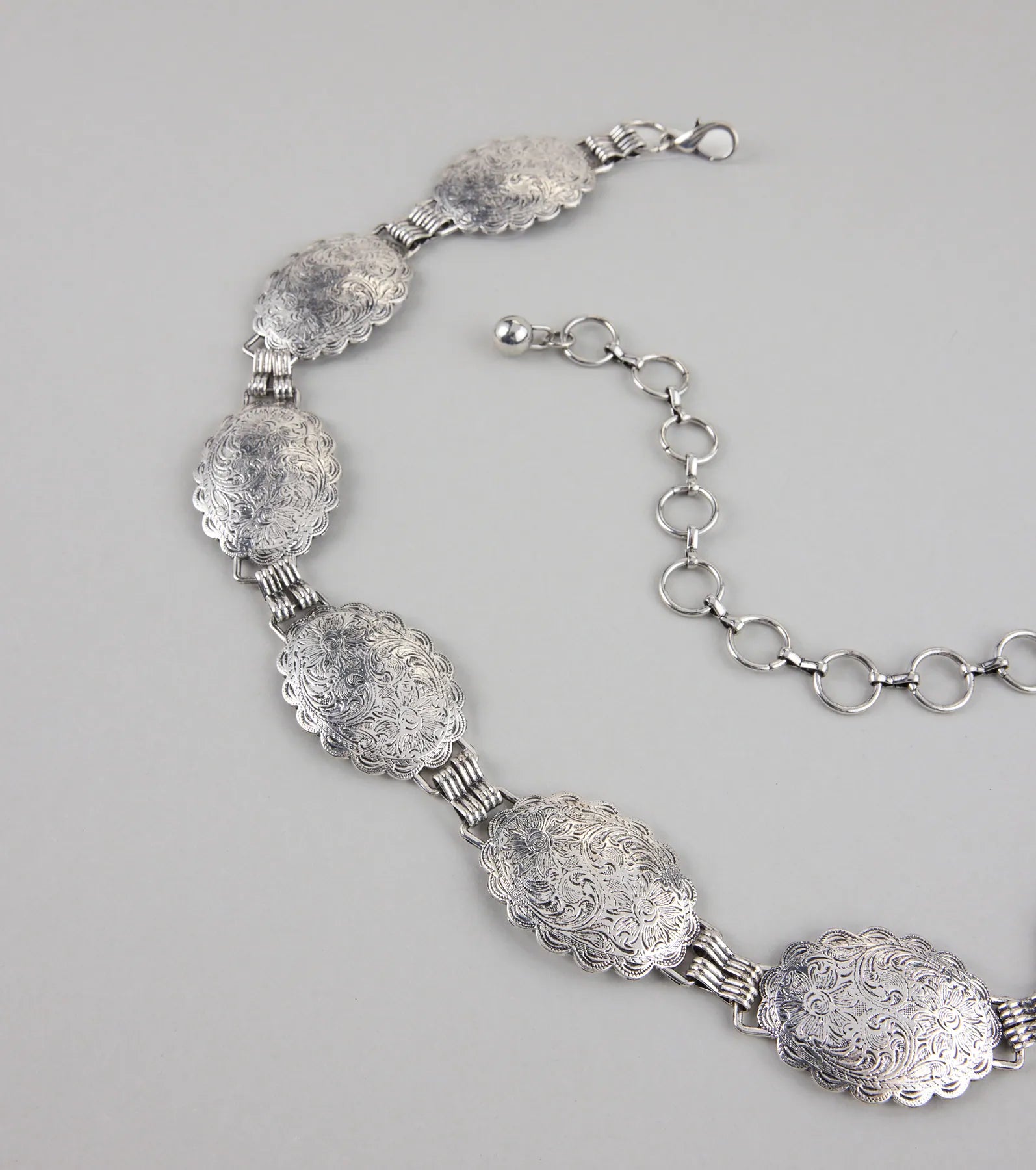 Elevate your outfit with this belt. a statement accessory that combines western-inspired concho details with glamorous chain detail.