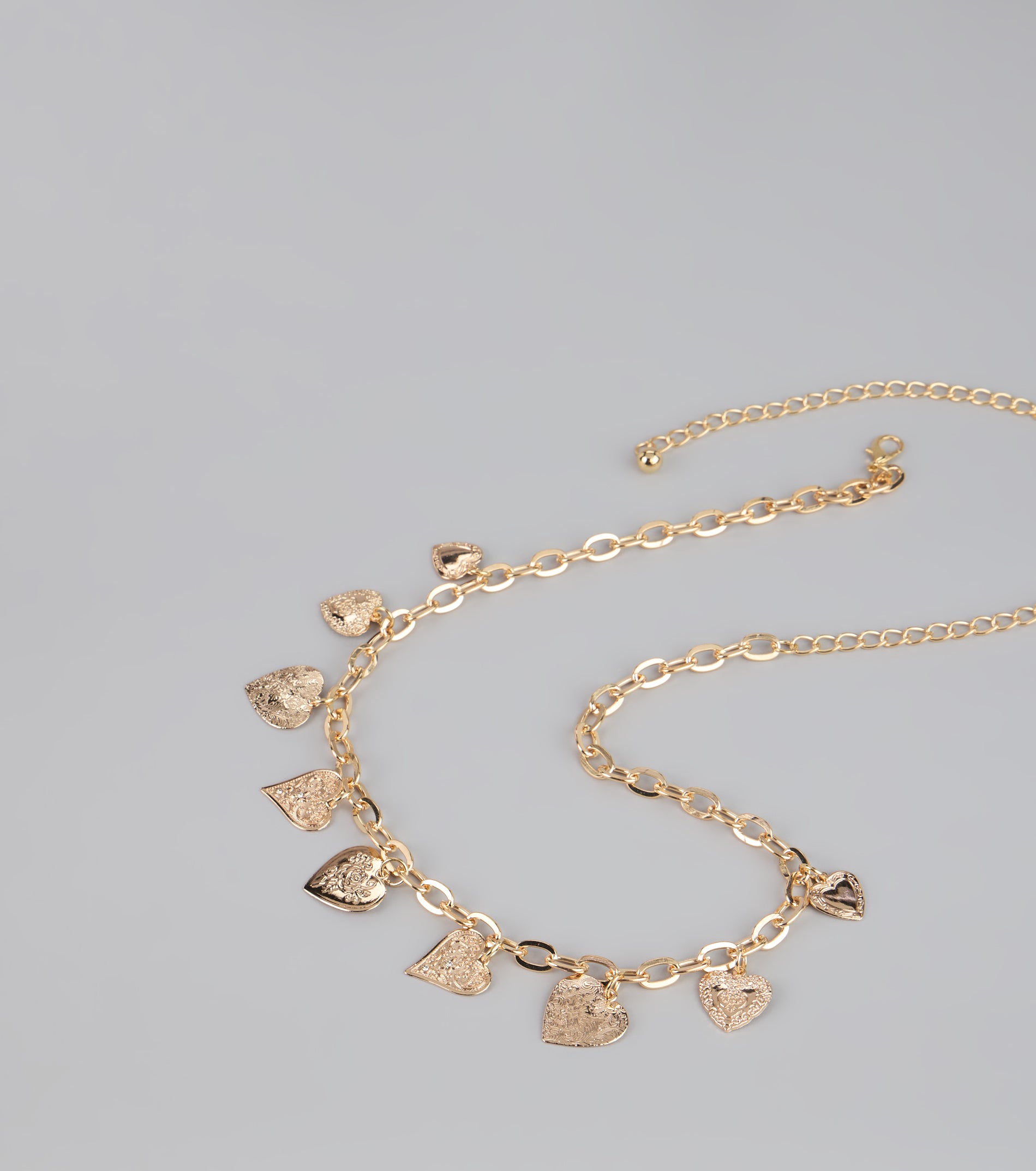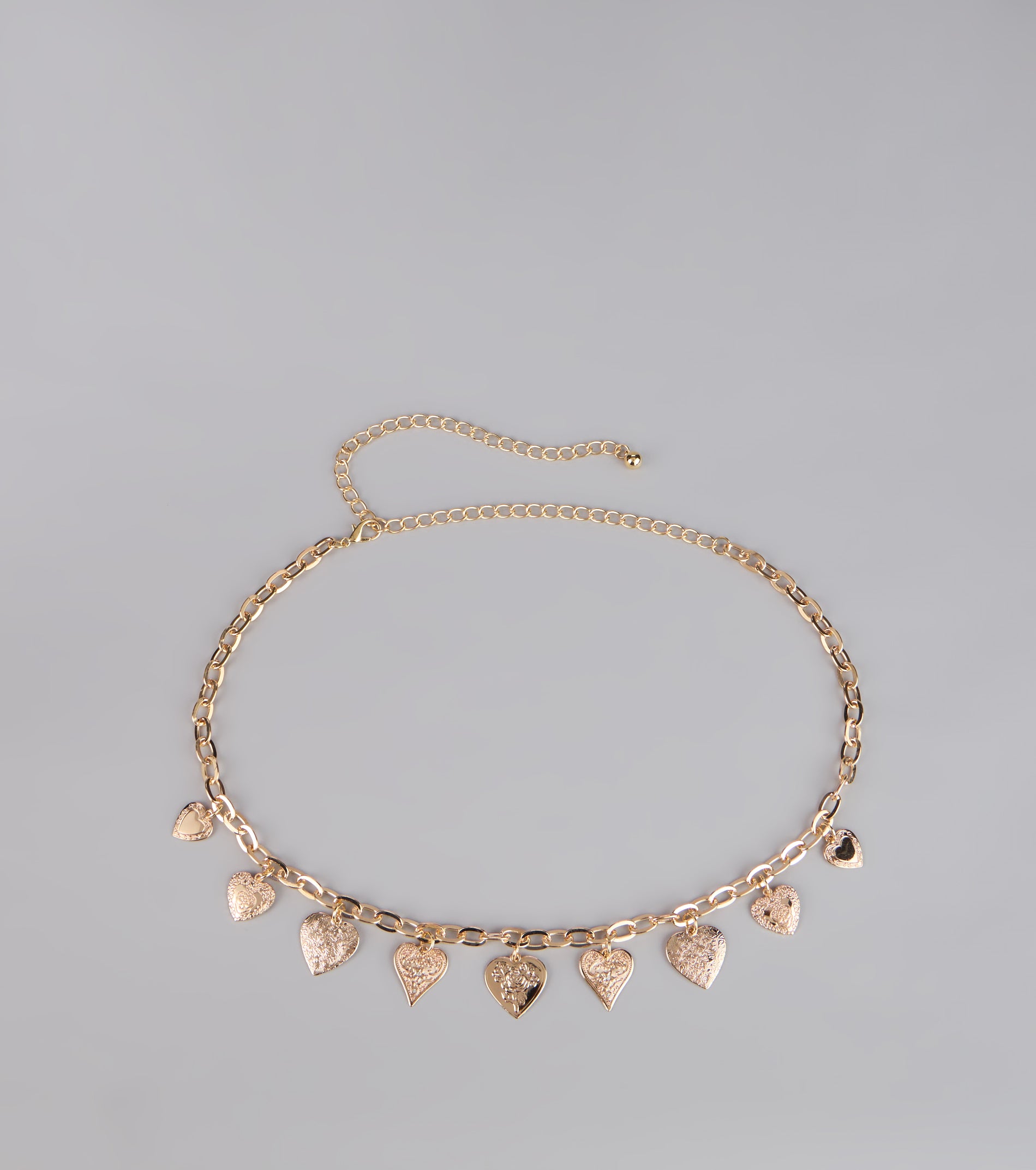 Show your waist some love with this golden heart charm chain belt. Featuring a series of textured heart pendants dangling from a sleek chain. it adds playful movement and shine to any outfit.