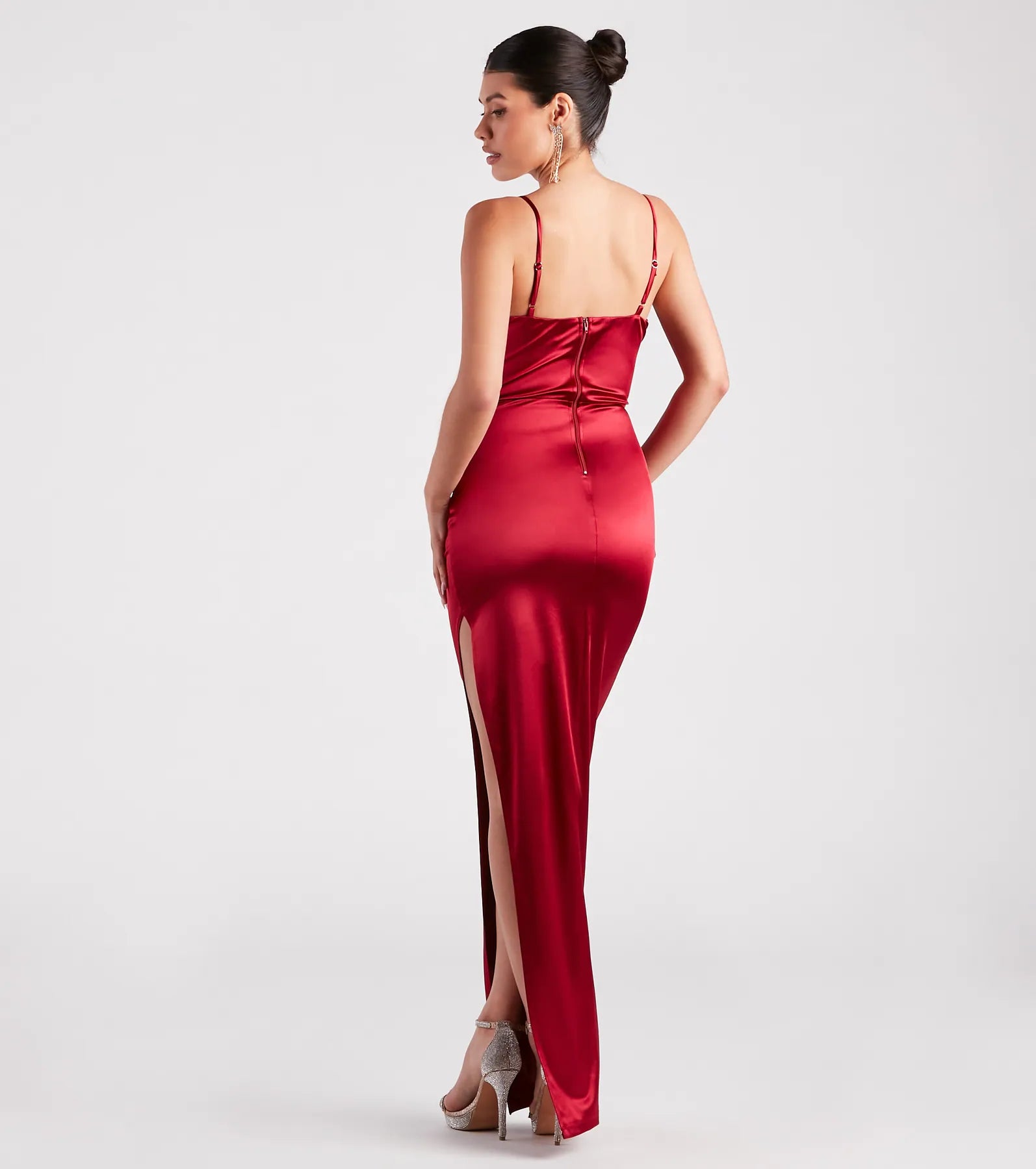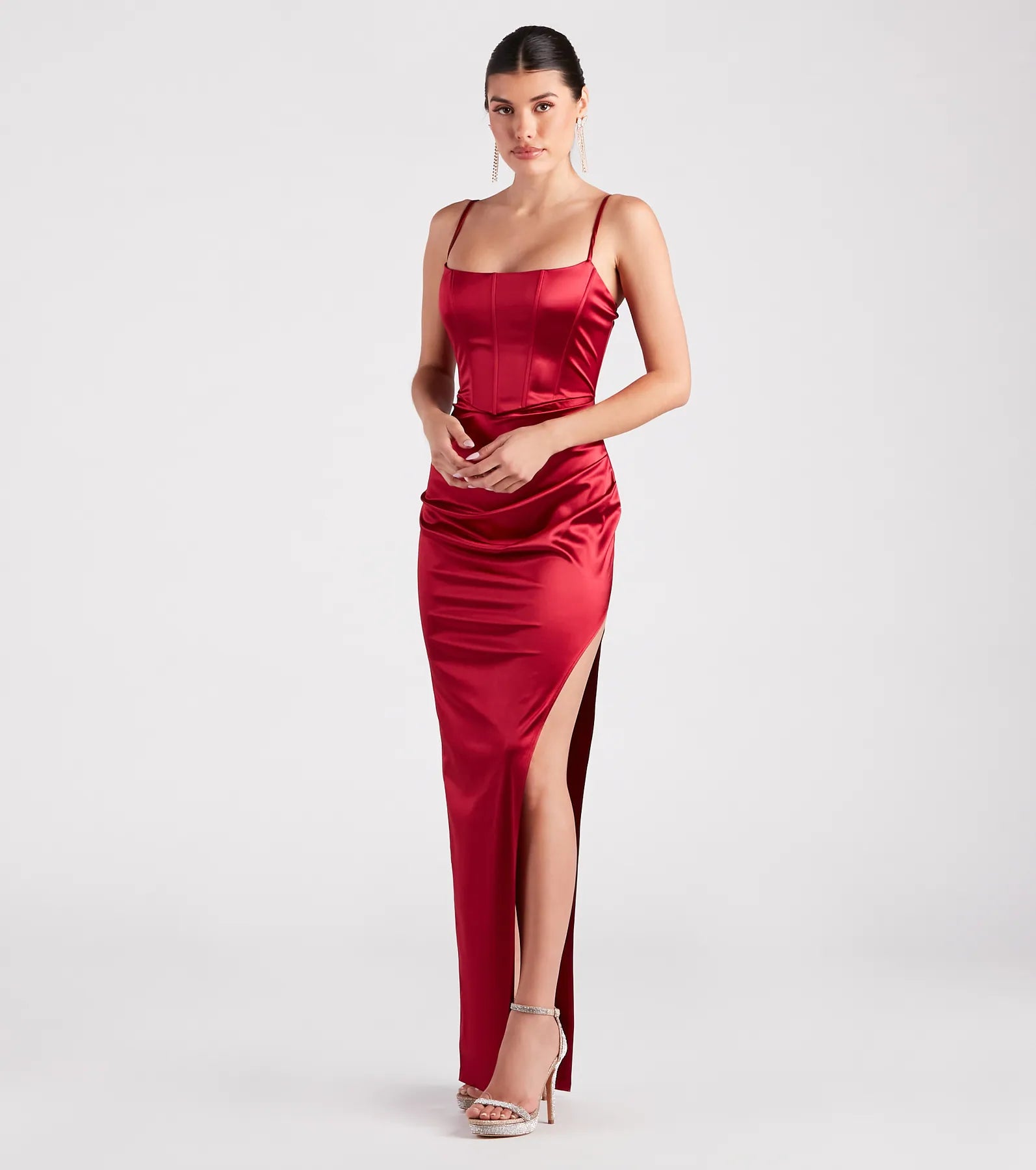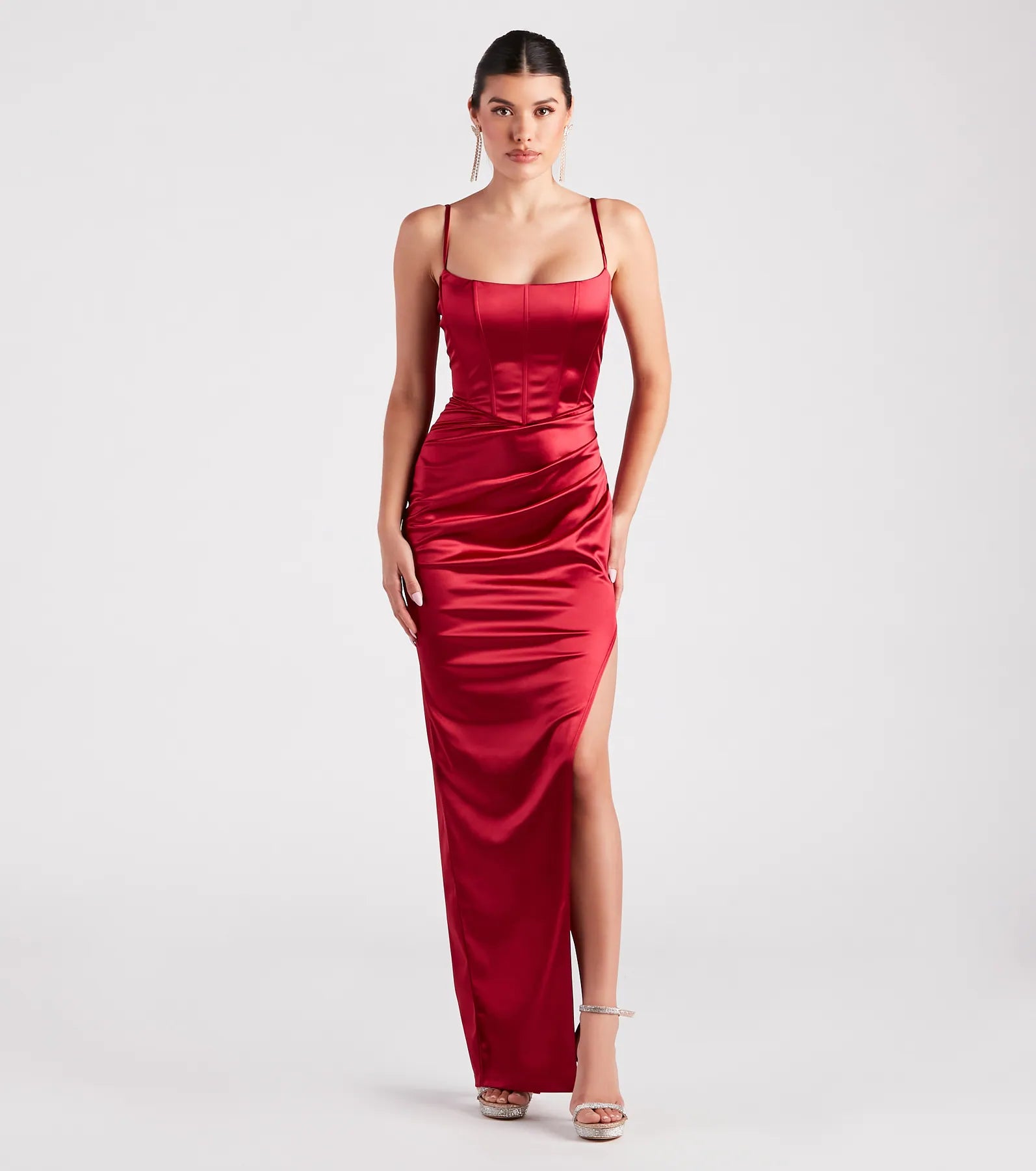 Look glamorous in the Helena formal satin dress to celebrate the perfect evening as a bridesmaid or wedding guest! She stuns in a flattering sleeveless corset bodice with adjustable spaghetti straps. flexible boning inserts. and a pleated side seam leading to the long hem with a sultry side slit. The formal dress is composed of luxurious silky satin-lined fabric with a moderate stretch. Complete the look with a and heels.